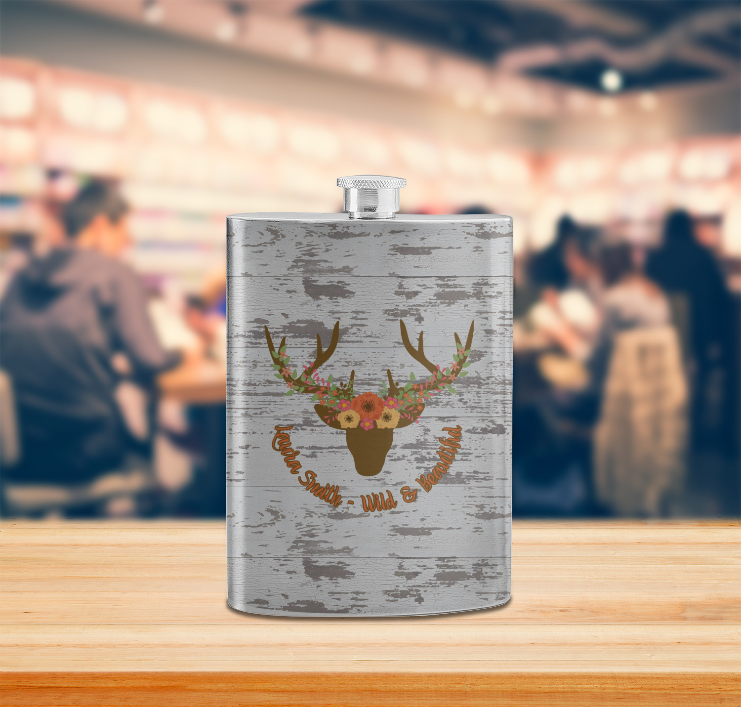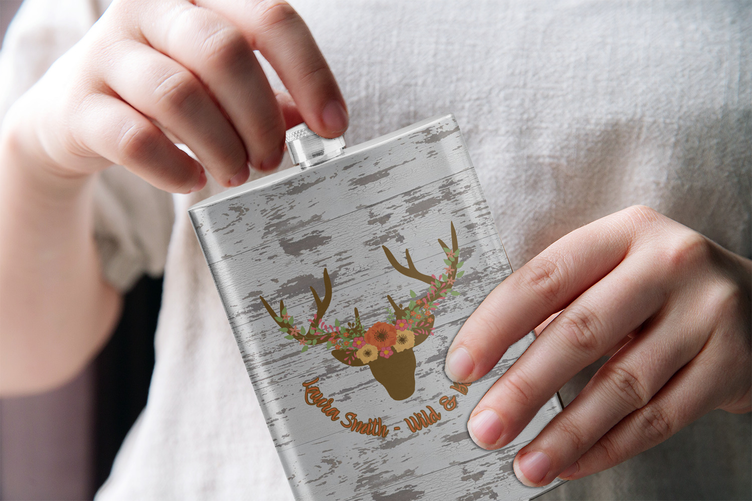 This design has a fun distressed shiplap background that is tones of white and grey. On top of this is an adorable deer illustration with flowers surrounding its antlers. Underneath is a curving area for personalization. Add your name or a fun saying. You will find brown, pink, peach, yellow, and green in this fun design.