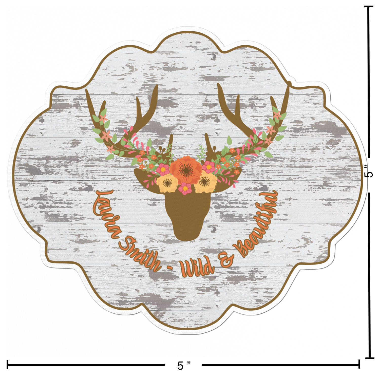 This design has a fun distressed shiplap background that is tones of white and grey. On top of this is an adorable deer illustration with flowers surrounding its antlers. Underneath is a curving area for personalization. Add your name or a fun saying. You will find brown, pink, peach, yellow, and green in this fun design.
