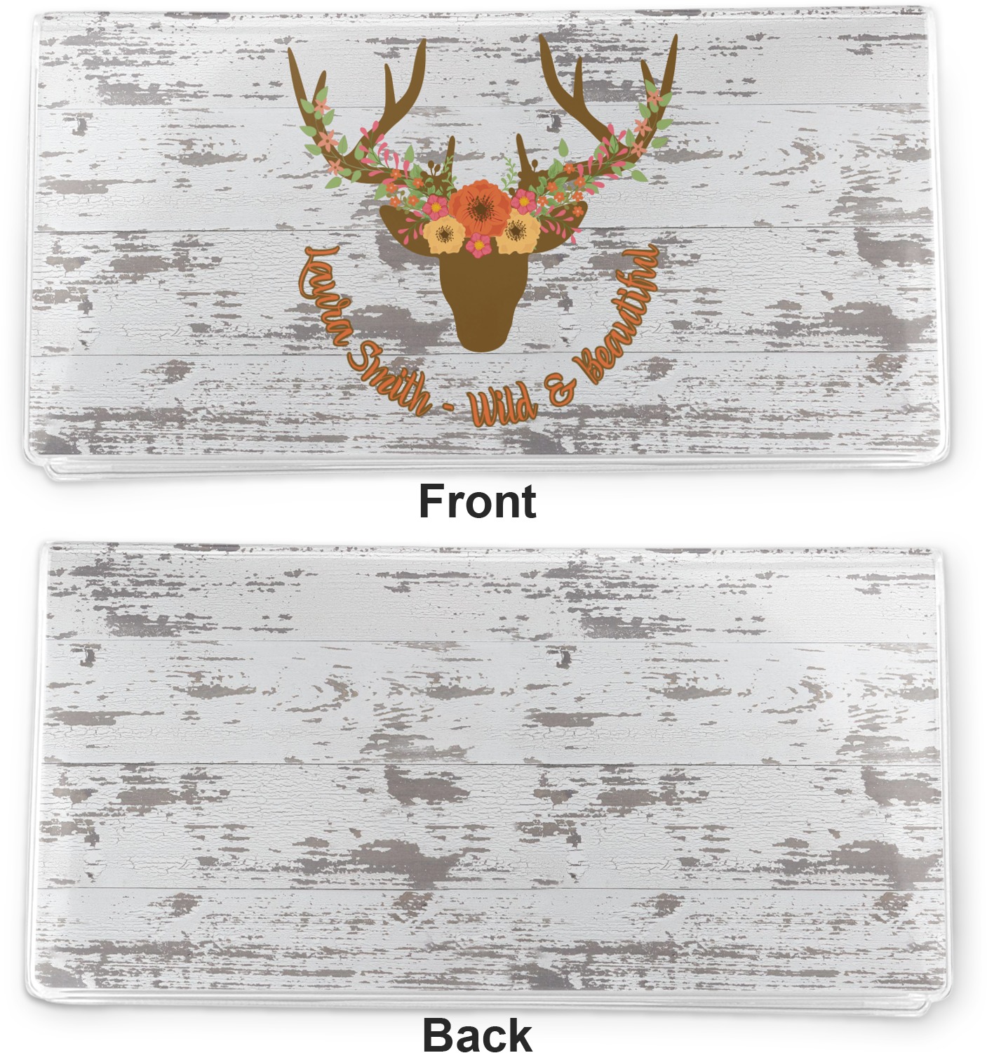 This design has a fun distressed shiplap background that is tones of white and grey. On top of this is an adorable deer illustration with flowers surrounding its antlers. Underneath is a curving area for personalization. Add your name or a fun saying. You will find brown, pink, peach, yellow, and green in this fun design.