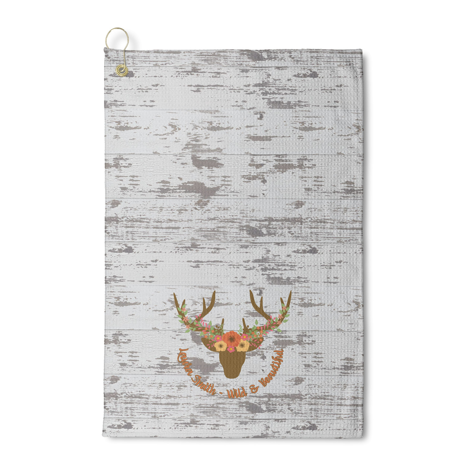 This design has a fun distressed shiplap background that is tones of white and grey. On top of this is an adorable deer illustration with flowers surrounding its antlers. Underneath is a curving area for personalization. Add your name or a fun saying. You will find brown, pink, peach, yellow, and green in this fun design.