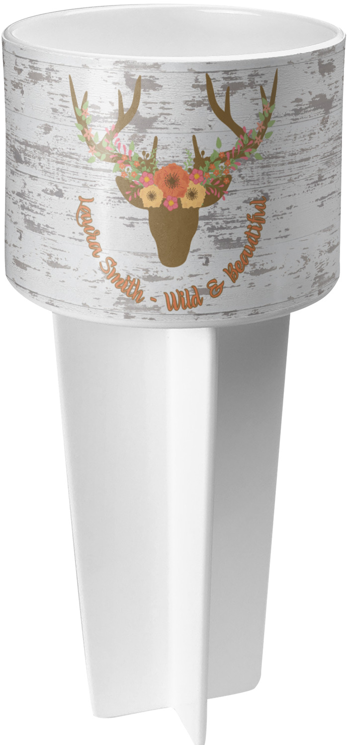 This cup holder has a large stake at its bottom that anchors it to the sand or ground below, while the cup holder rests above the stake. The entire drink holder is made of durable plastic and displays your customization around the cup holder portion. We sell these personalized beach spikers in two different colors: black and white.