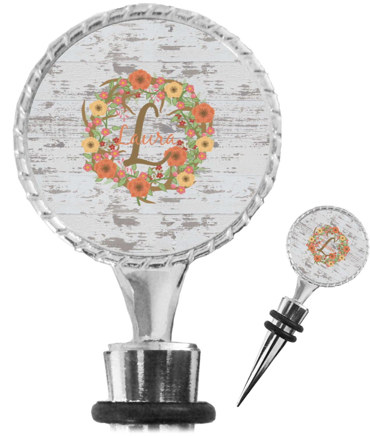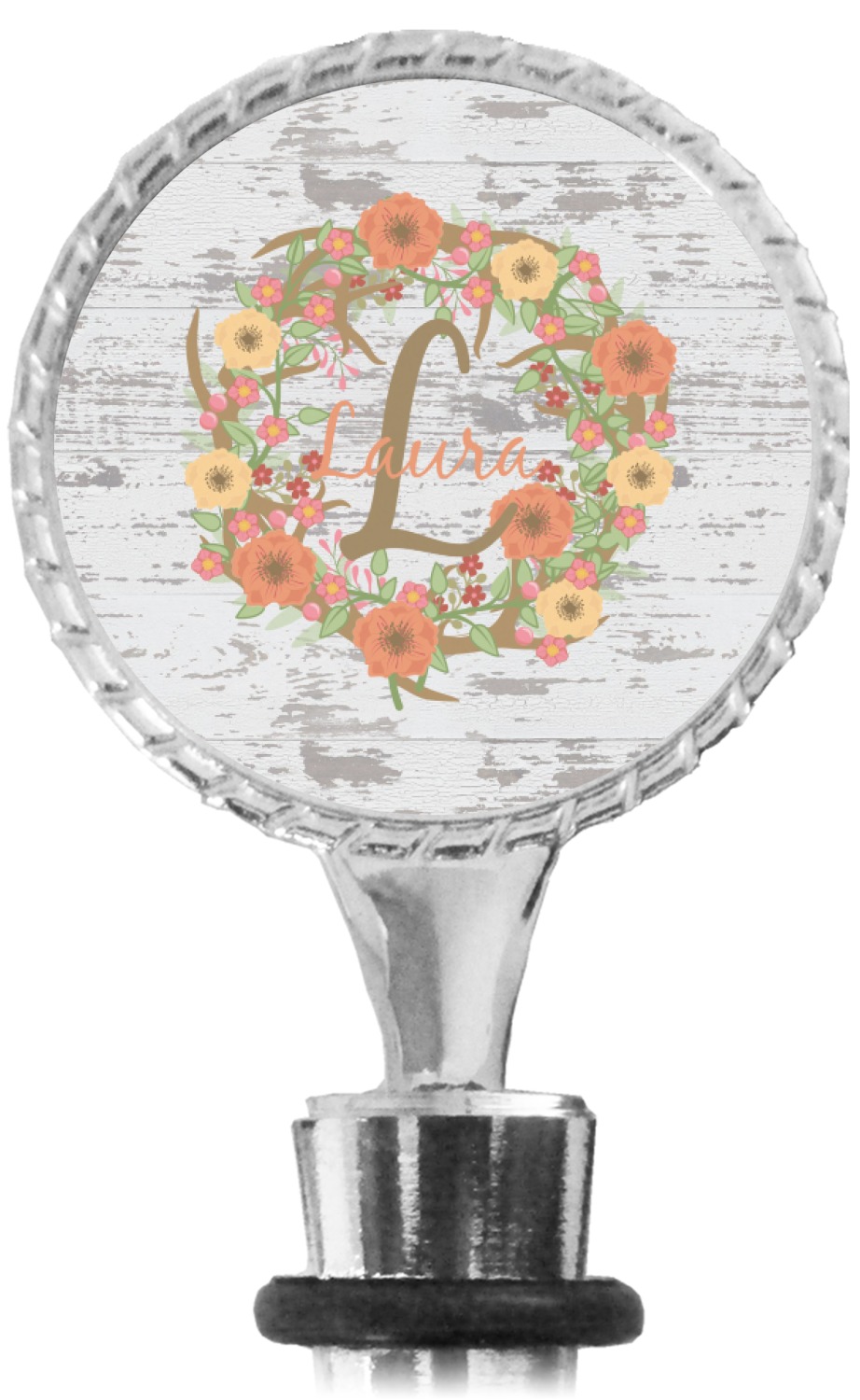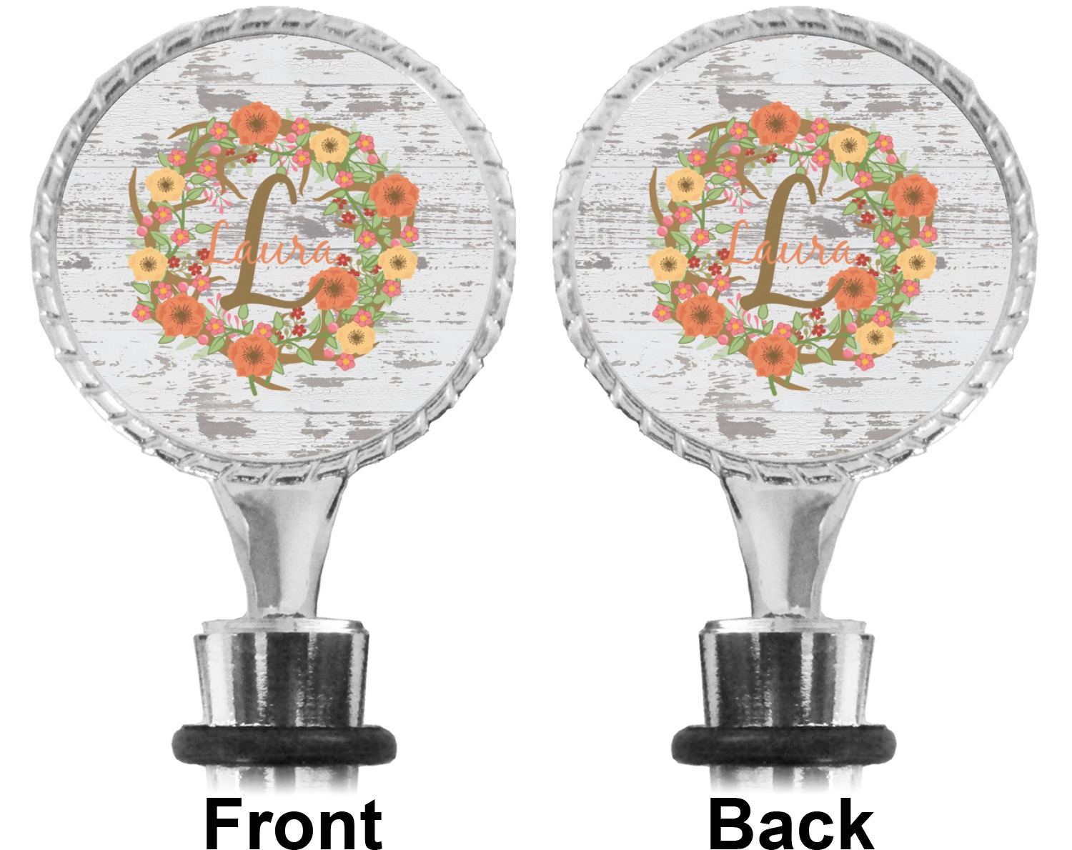 The top part of your bottle stopper is comprised of a zinc ring that displays your customization(s) in its middle, on both sides. The ring is heavy duty, with a bright chrome finish. The body of the wine stoppers have two silicone rings to provide an airtight seal. These wine bottle stoppers measure at 1.625" L x 0.8125" W x 4.625" H; your custom wine stopper is meant to fit into most standard-sized wine bottles.