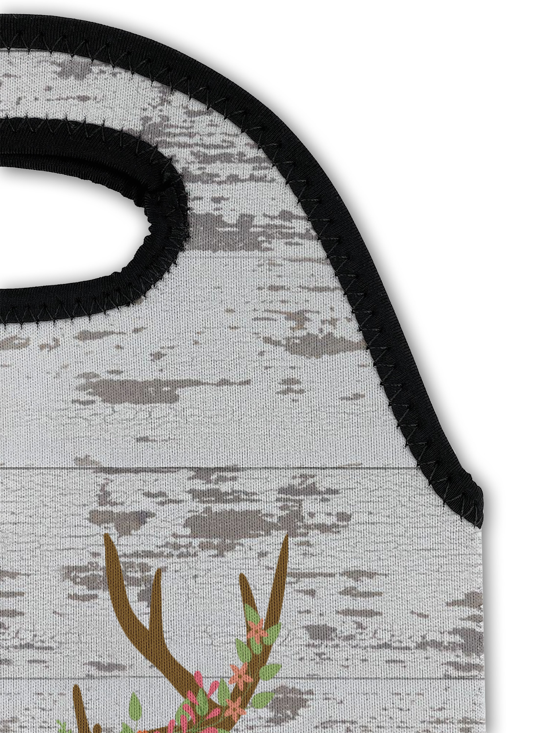 This design has a fun distressed shiplap background that is tones of white and grey. On top of this is an adorable deer illustration with flowers surrounding its antlers. Underneath is a curving area for personalization. Add your name or a fun saying. You will find brown, pink, peach, yellow, and green in this fun design.
