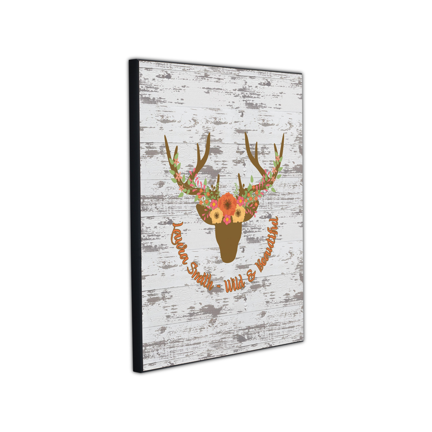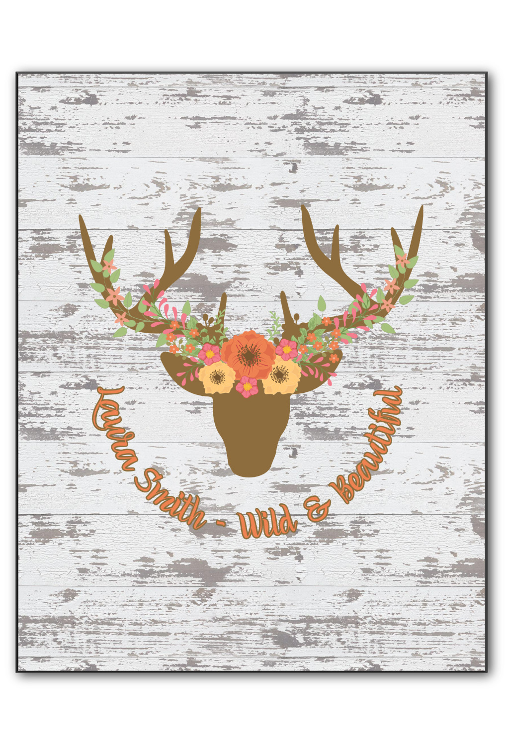 This design has a fun distressed shiplap background that is tones of white and grey. On top of this is an adorable deer illustration with flowers surrounding its antlers. Underneath is a curving area for personalization. Add your name or a fun saying. You will find brown, pink, peach, yellow, and green in this fun design.