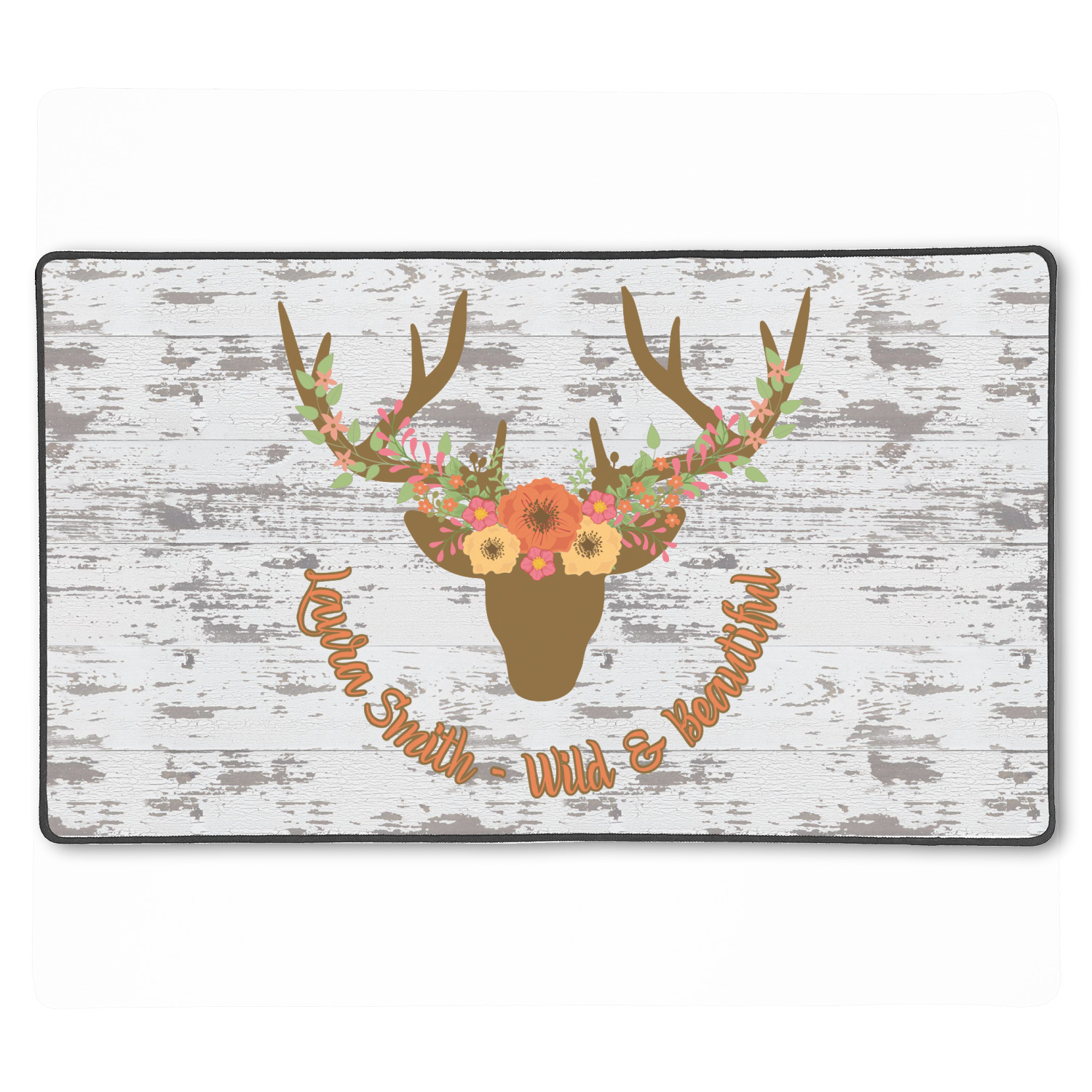 This design has a fun distressed shiplap background that is tones of white and grey. On top of this is an adorable deer illustration with flowers surrounding its antlers. Underneath is a curving area for personalization. Add your name or a fun saying. You will find brown, pink, peach, yellow, and green in this fun design.