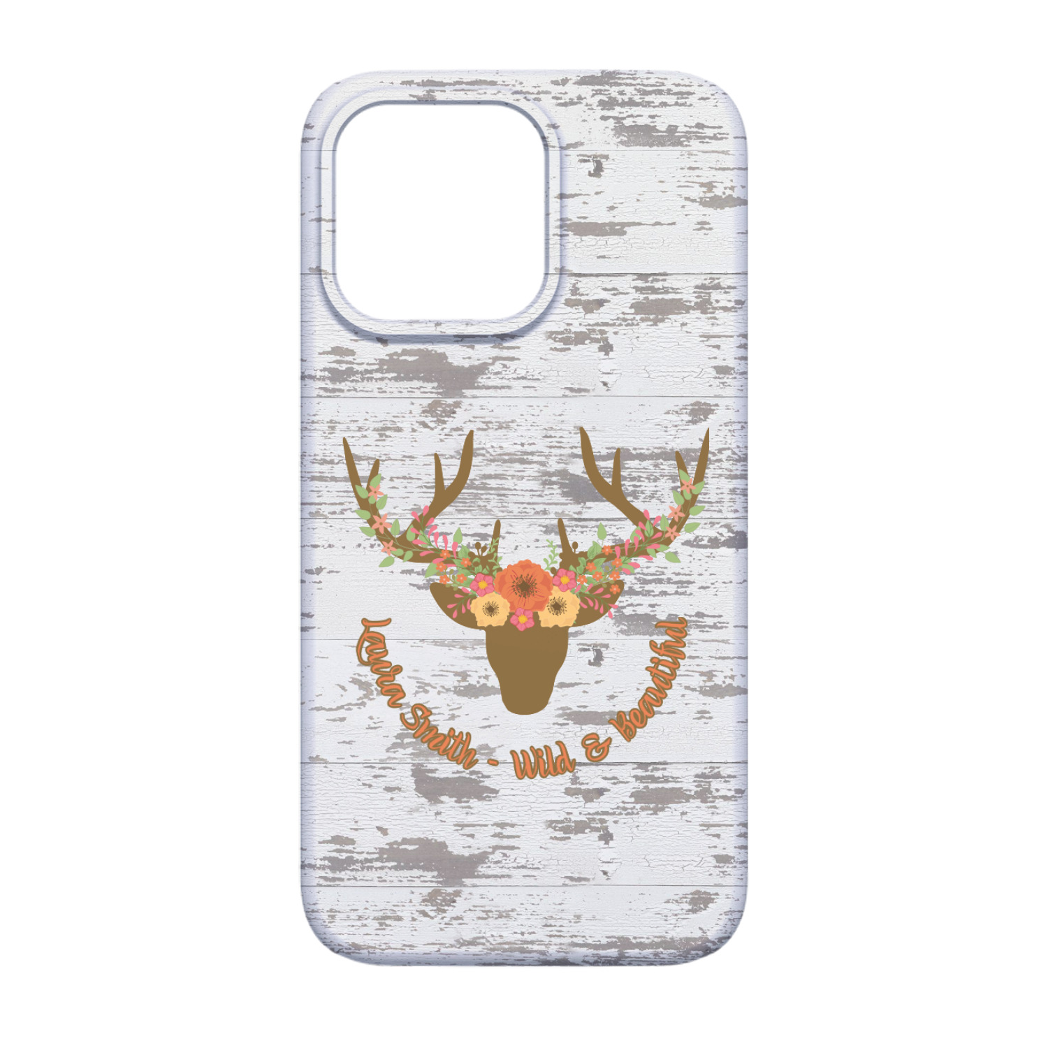 This design has a fun distressed shiplap background that is tones of white and grey. On top of this is an adorable deer illustration with flowers surrounding its antlers. Underneath is a curving area for personalization. Add your name or a fun saying. You will find brown, pink, peach, yellow, and green in this fun design.