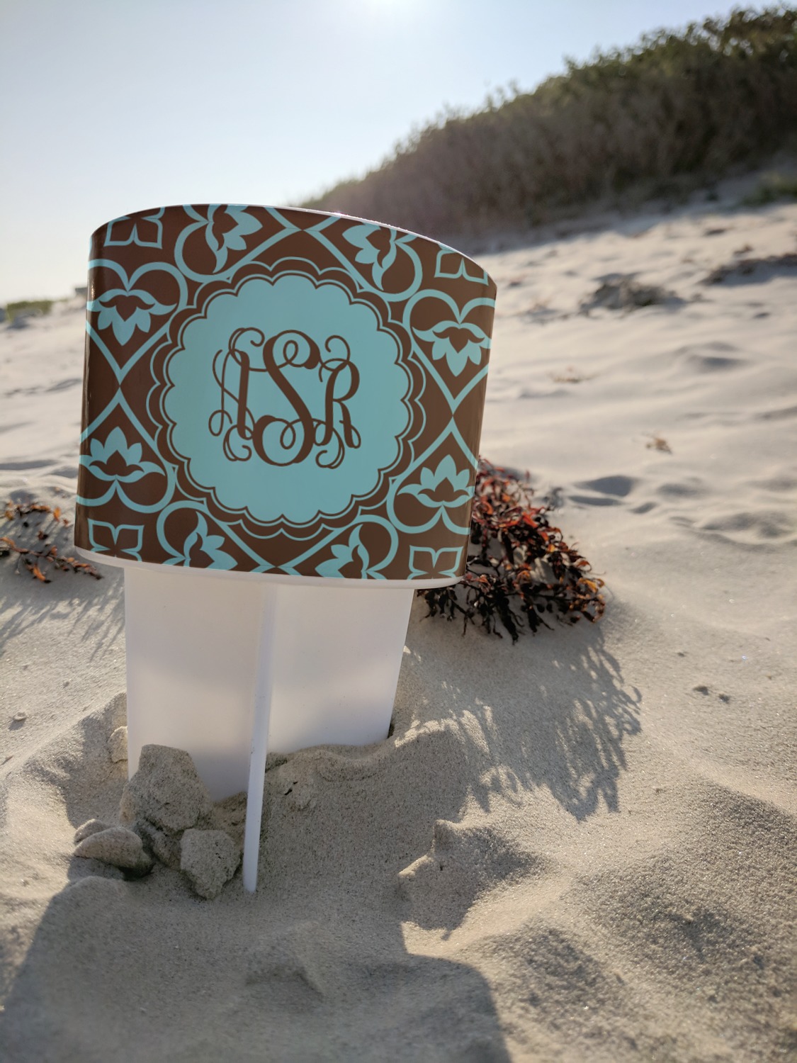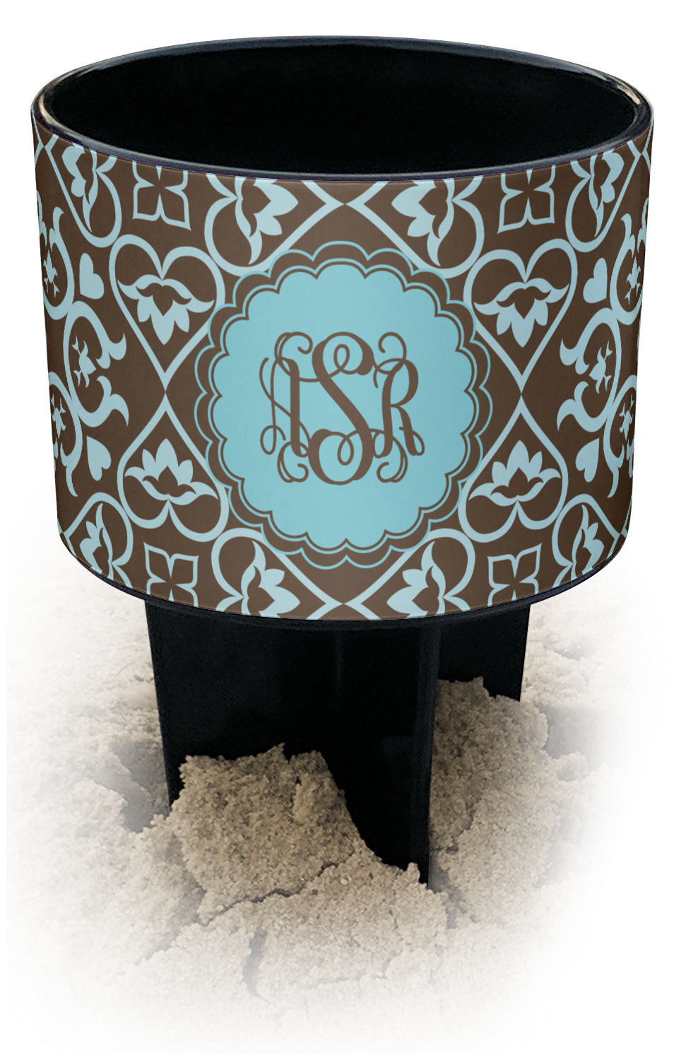 This cup holder has a large stake at its bottom that anchors it to the sand or ground below, while the cup holder rests above the stake. The entire drink holder is made of durable plastic and displays your customization around the cup holder portion. We sell these personalized beach spikers in two different colors: black and white.