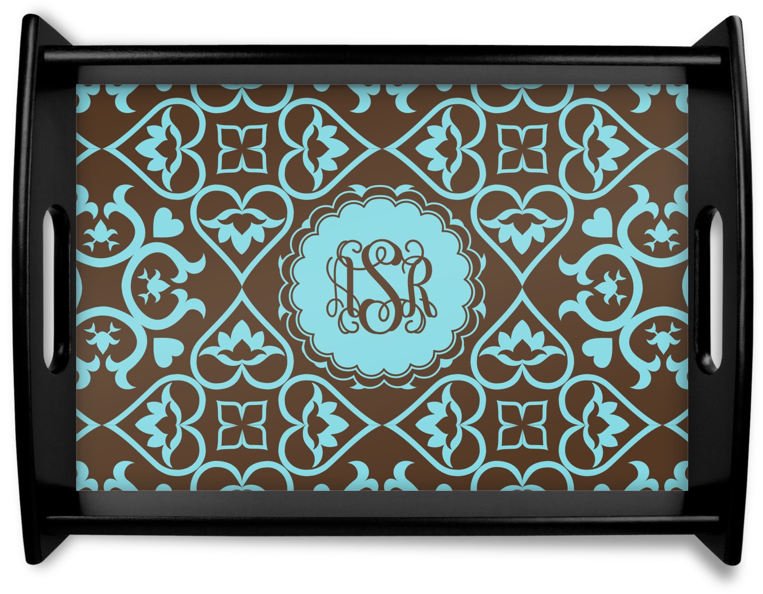 This serving tray with handles features square edges and two rounded sides, creating a very modern look. Each side is fabricated from a beautifully cut, natural wood. The bottom of the interior of the tray displays your customized design in bright, vibrant color. The tray is sold in both a black color and a natural wood look. Each variation of the wood serving tray has two sizes: Small, which is 14" x 10" x 2.25", and Large, which is 19.5" x 13.5" x 2.75".