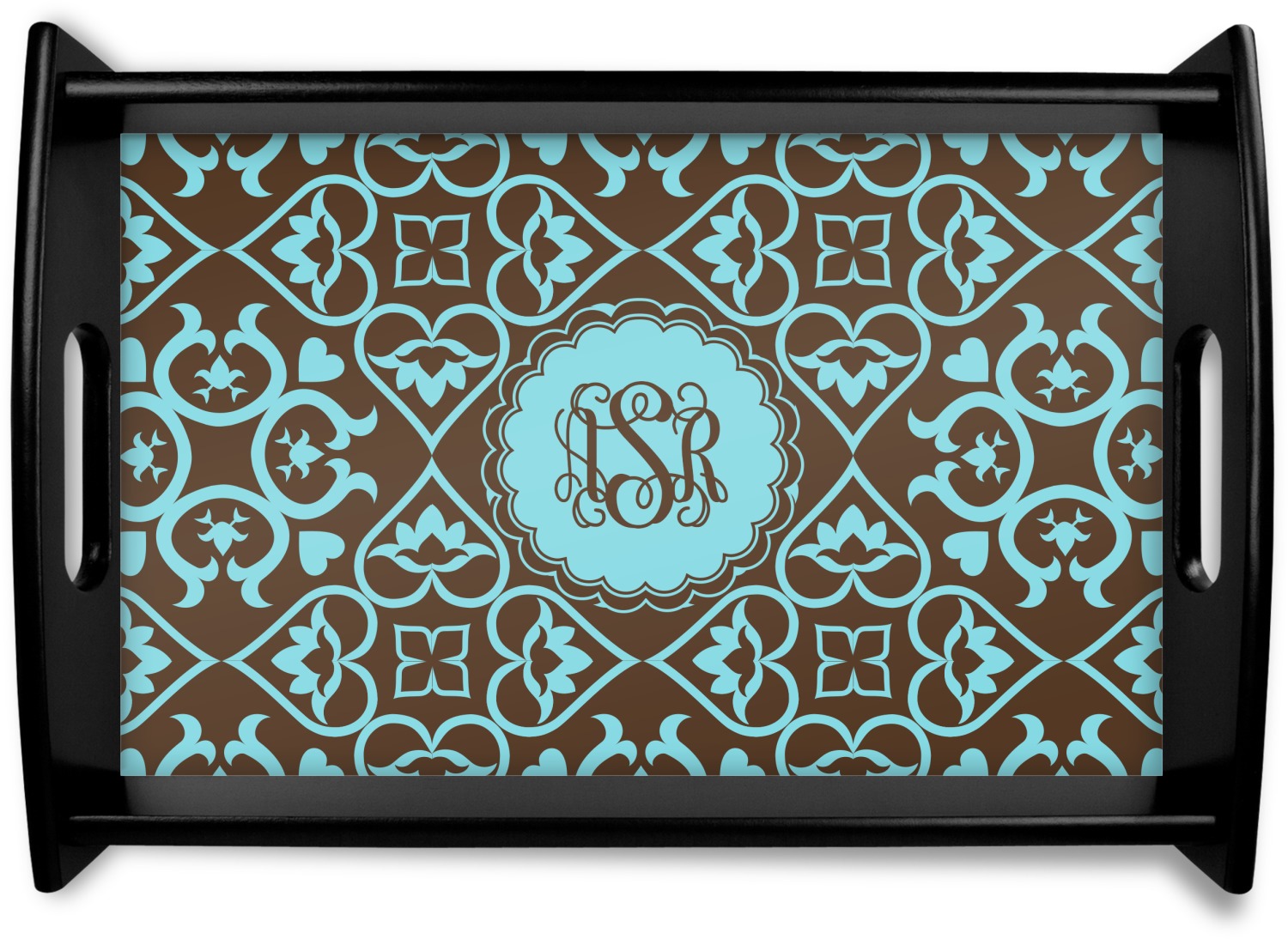 This serving tray with handles features square edges and two rounded sides, creating a very modern look. Each side is fabricated from a beautifully cut, natural wood. The bottom of the interior of the tray displays your customized design in bright, vibrant color. The tray is sold in both a black color and a natural wood look. Each variation of the wood serving tray has two sizes: Small, which is 14" x 10" x 2.25", and Large, which is 19.5" x 13.5" x 2.75".