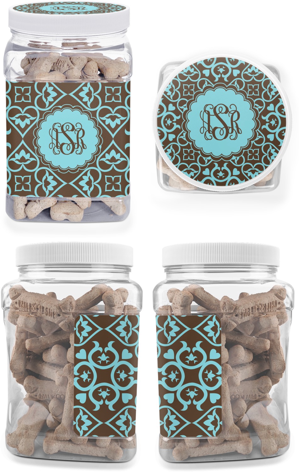 This half gallon jar, made from a sturdy plastic, is the perfect way to keep treats from any naughty pet paws, while still keeping them ready on hand for when your pup performs an impressive trick. This dog cookie jar features a screw-on, white lid that displays your personalized design on a vinyl sticker. We apply another customized sticker that wraps around the front and sides of the jar. Our dog treat jar also has indentations on the rear ends of the sides, which allows for convenient handling, and its square frame allows for easy storage.