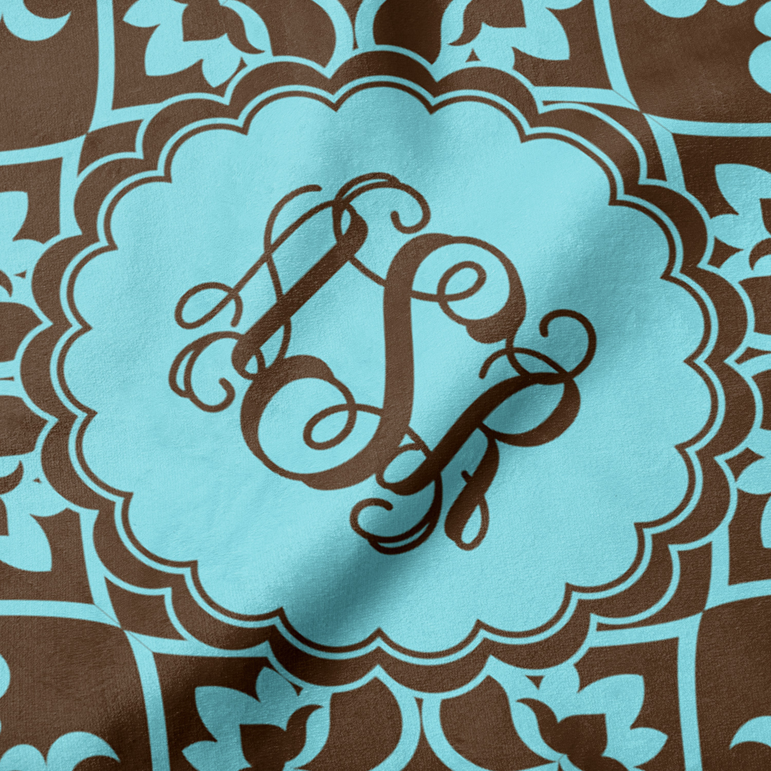 A blue scalloped label highlights a classic personalized monogram or personalization of your choice.