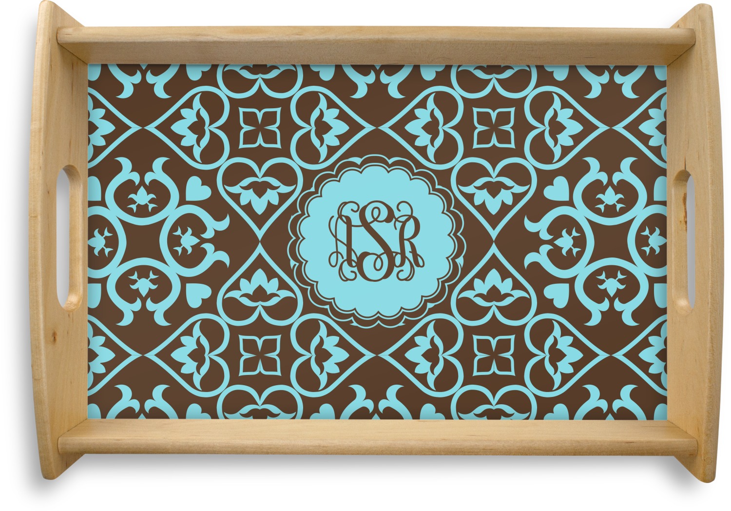This serving tray with handles features square edges and two rounded sides, creating a very modern look. Each side is fabricated from a beautifully cut, natural wood. The bottom of the interior of the tray displays your customized design in bright, vibrant color. The tray is sold in both a black color and a natural wood look. Each variation of the wood serving tray has two sizes: Small, which is 14" x 10" x 2.25", and Large, which is 19.5" x 13.5" x 2.75".