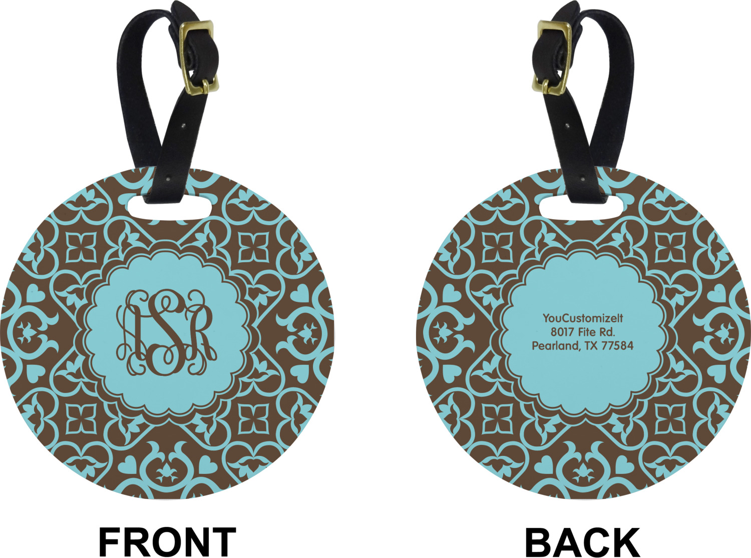 These personalized bag tags are sold in a variety of shapes, so that you may find the product that meets your vision exactly. We sell a round luggage tag, which measures at approximately 4" x 4". Our square luggage tag is about 3.5" x 3.5", while our rectangular version is 2.75" x 4 ".