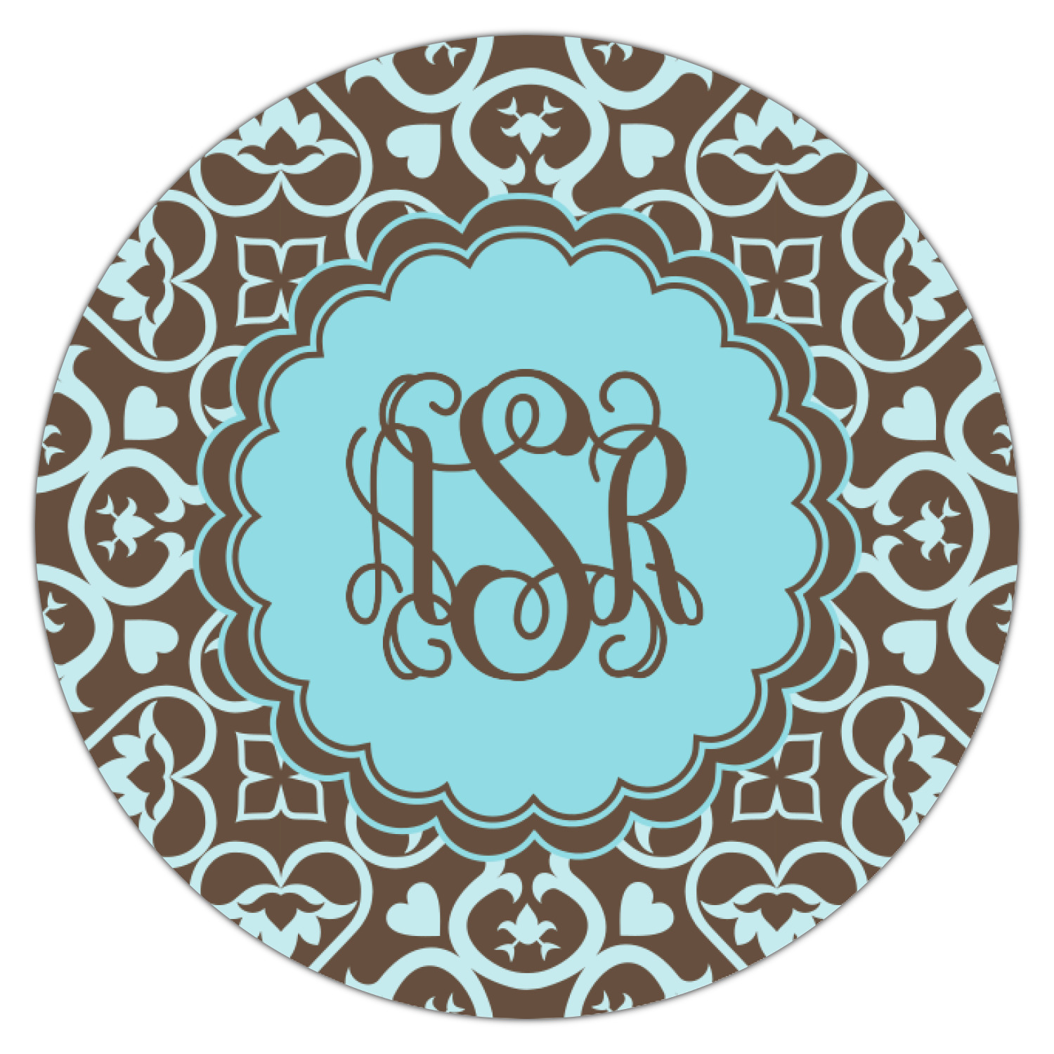 A blue scalloped label highlights a classic personalized monogram or personalization of your choice.