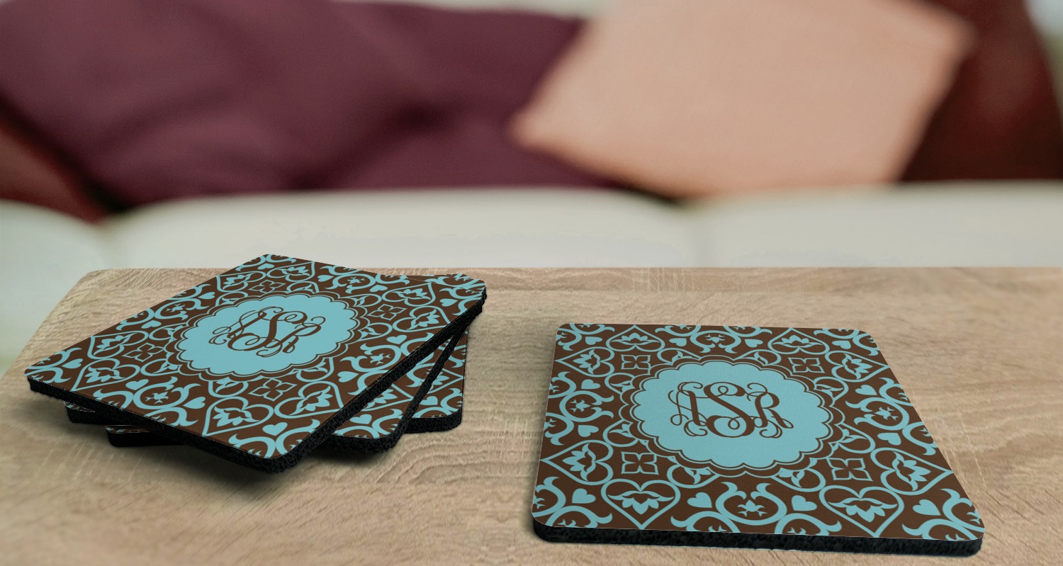 These drink coasters have a smooth, polyester top and a textured, rubber backing on its bottom. The non-slip rubber backing underneath works to keep any spills at bay. At 4 by 4 by 0.25 inches thick, these custom coasters are a suitable size for most drinkware. Your personalization is displayed atop the face of the cup coaster. We sell these rubber coasters in two different shapes: square and round. You can buy each shape as singulars or as a set of 4.