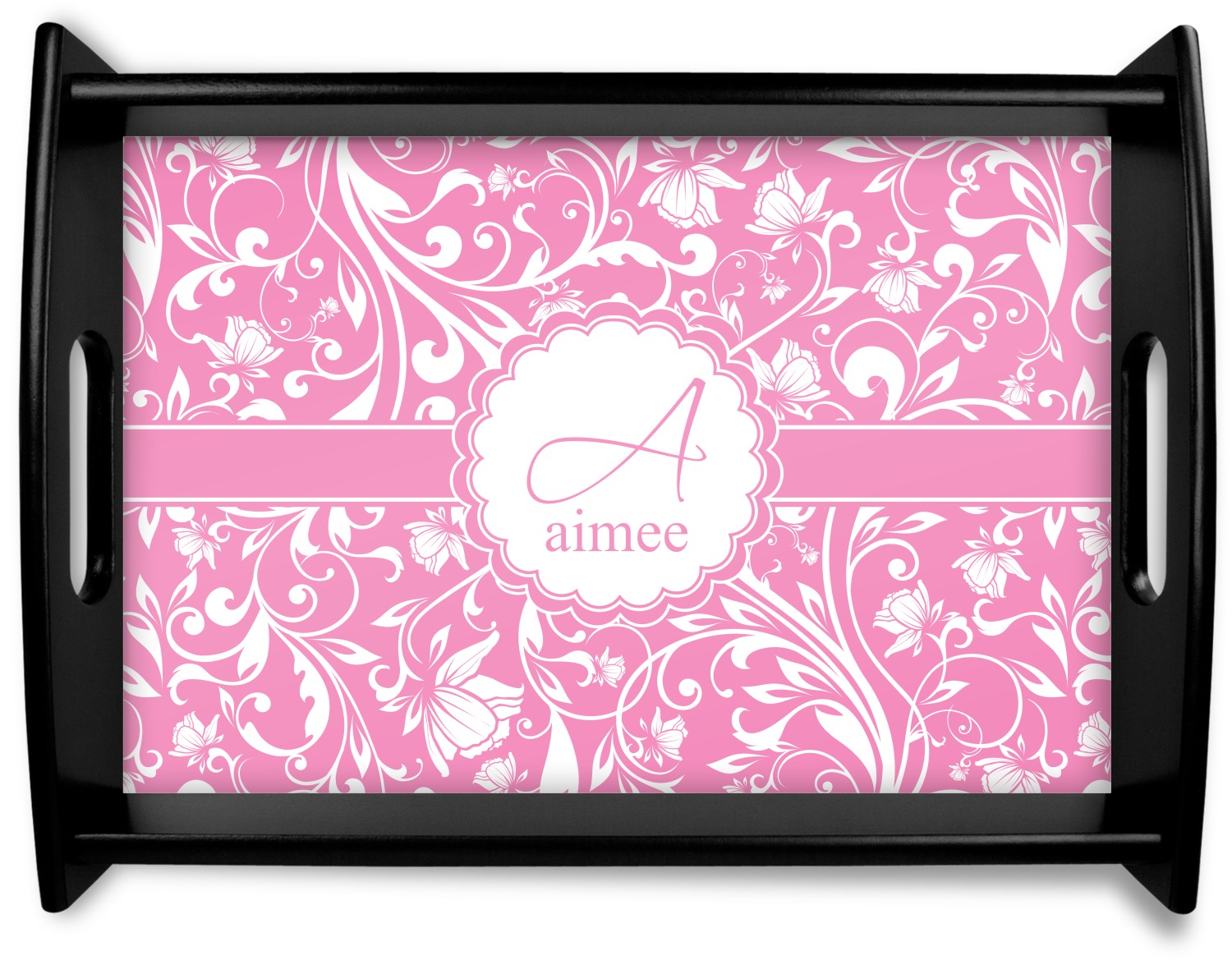 This serving tray with handles features square edges and two rounded sides, creating a very modern look. Each side is fabricated from a beautifully cut, natural wood. The bottom of the interior of the tray displays your customized design in bright, vibrant color. The tray is sold in both a black color and a natural wood look. Each variation of the wood serving tray has two sizes: Small, which is 14" x 10" x 2.25", and Large, which is 19.5" x 13.5" x 2.75".