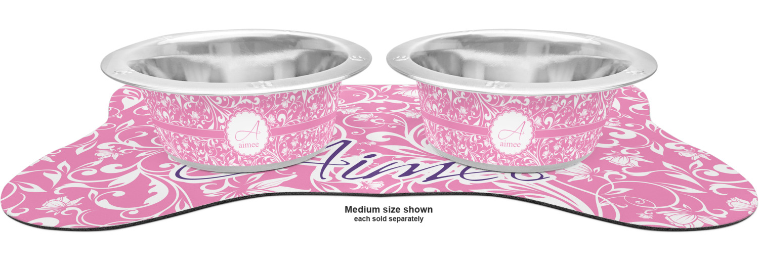 The top of this mat displays your custom design, as it is printed on polyester. To prevent slippage, the underside of the mat is made of rubber. We offer a small dog food mat, suitable for smaller dogs and a large dog food mat for bigger breeds. The small dog food mat is approximately 19 by 13 inches, while the large dog feeding mat measures at approximately 26.75 by 18 inches. Both personalized mats are ideally sized to fit two dog bowls.