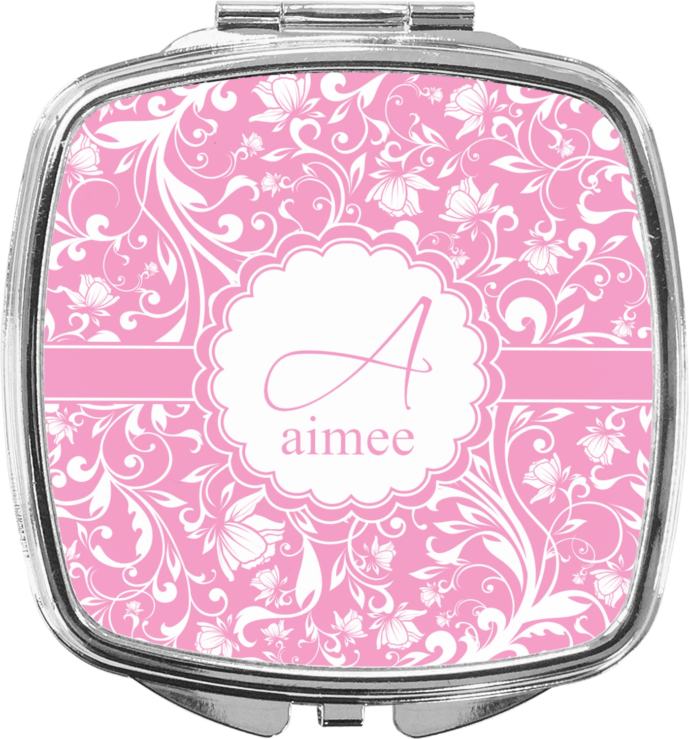 Our compact mirrors are customized with your design on one side. The other side is patterned silver tone metal. Inside, there are two mirrors.