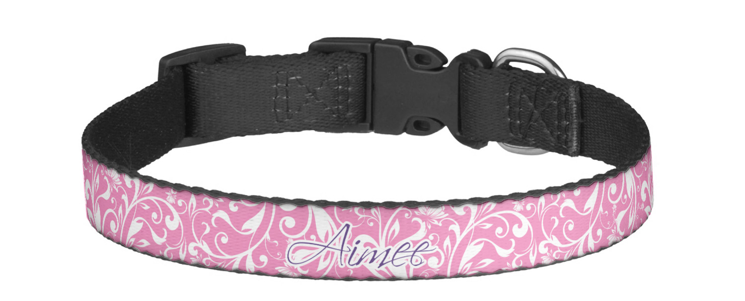 This sturdy collar, made from a durable nylon weave, will outlive your dog's episodes of excited tugging and pulling. Courtesy of its thick plastic buckle and adjuster, this collar is adjustable and accommodating of any dog. Structurally, the collar is a single piece of nylon weave that is sewn together, and features a solid metal loop where you can attach a leash or dog tag. We print and display your dog's name and pattern across the middle of the personalized dog collar.
