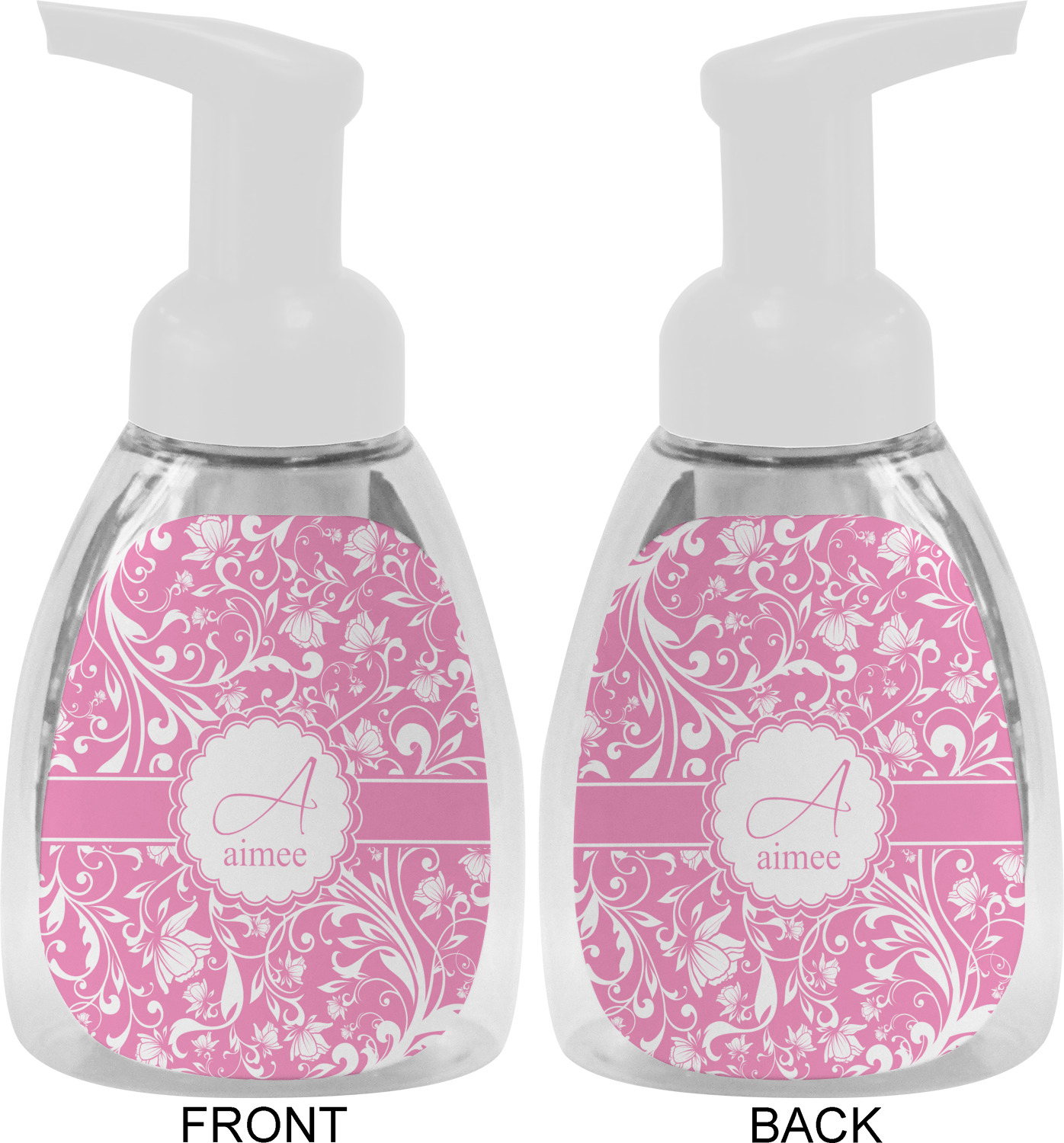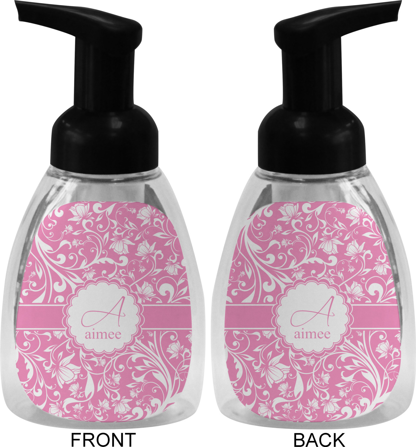 This soap dispenser is made of a robust plastic and has a clear base. The included soap pump is available in black or white color. This dispenser is 6.5 inches tall, 3 inches wide, and 2 inches deep. We display your customized designs on the front and back sides of these foaming hand soap dispensers.