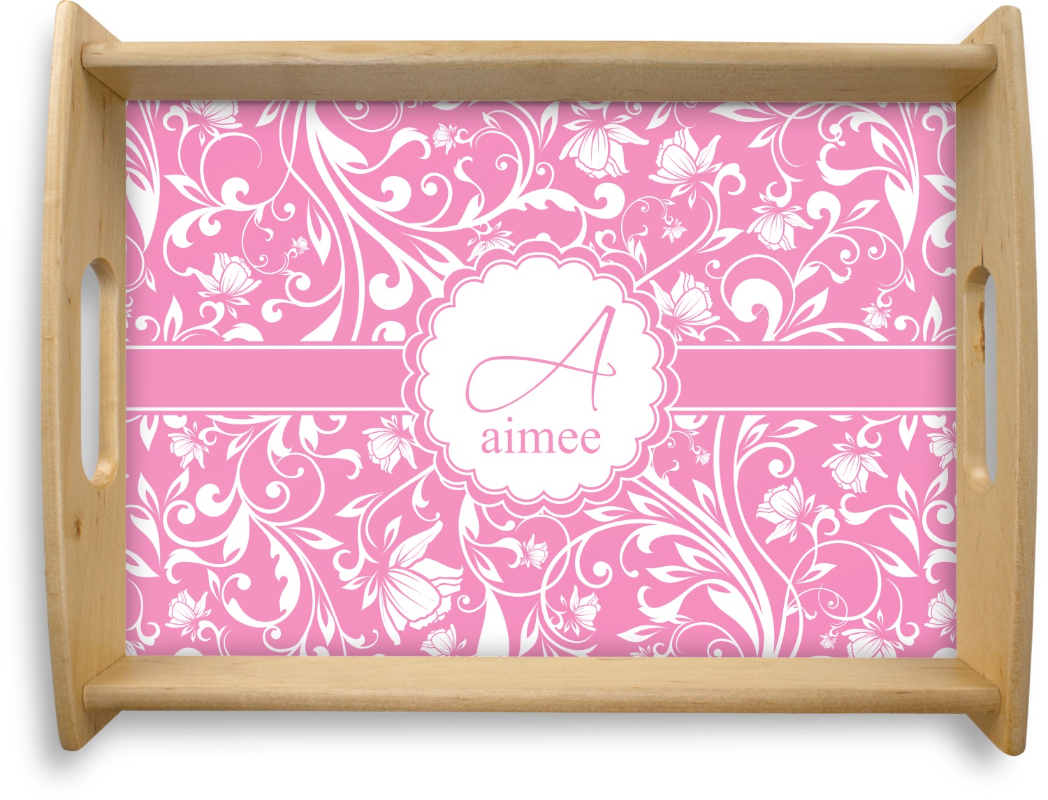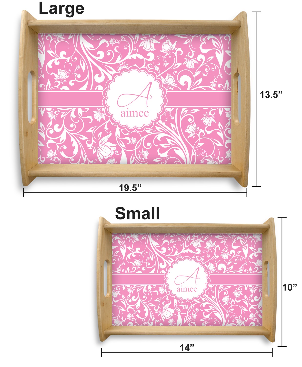 This serving tray with handles features square edges and two rounded sides, creating a very modern look. Each side is fabricated from a beautifully cut, natural wood. The bottom of the interior of the tray displays your customized design in bright, vibrant color. The tray is sold in both a black color and a natural wood look. Each variation of the wood serving tray has two sizes: Small, which is 14" x 10" x 2.25", and Large, which is 19.5" x 13.5" x 2.75".