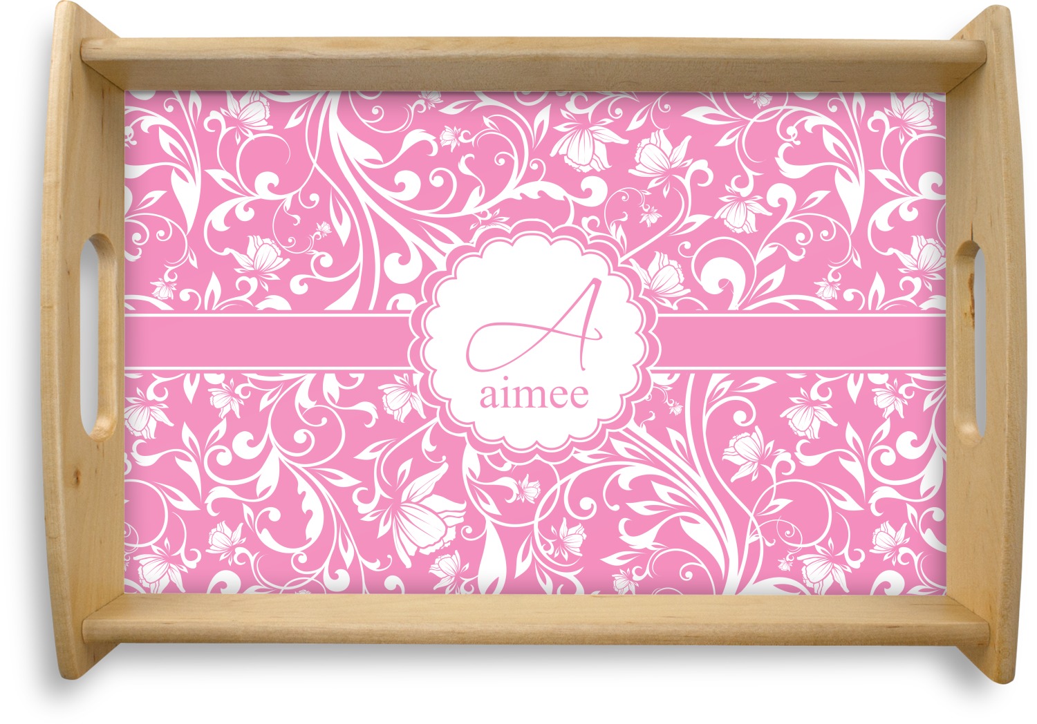This serving tray with handles features square edges and two rounded sides, creating a very modern look. Each side is fabricated from a beautifully cut, natural wood. The bottom of the interior of the tray displays your customized design in bright, vibrant color. The tray is sold in both a black color and a natural wood look. Each variation of the wood serving tray has two sizes: Small, which is 14" x 10" x 2.25", and Large, which is 19.5" x 13.5" x 2.75".