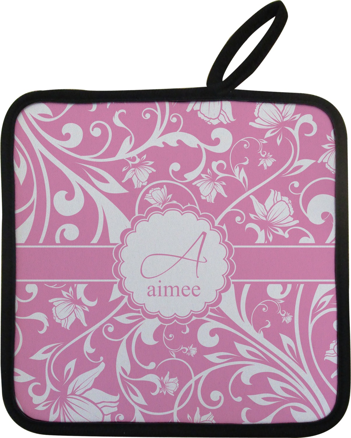 Along with our heat resistant gloves, we also carry personalized pot holders. These pot holders also feature a neoprene front that displays your personalization, and a textured, rubber backing for a sturdy grip. The two materials are connected with a sleek, black trim, and the hot pot holder also includes an attached loop for hanging and storage. You can purchase a kitchen pot holder by itself, or alongside a right or left oven mitt, depending on your needs. The pot holder itself is approximately 8.75 inches by 8.75 inches and 0.25 inches tall.