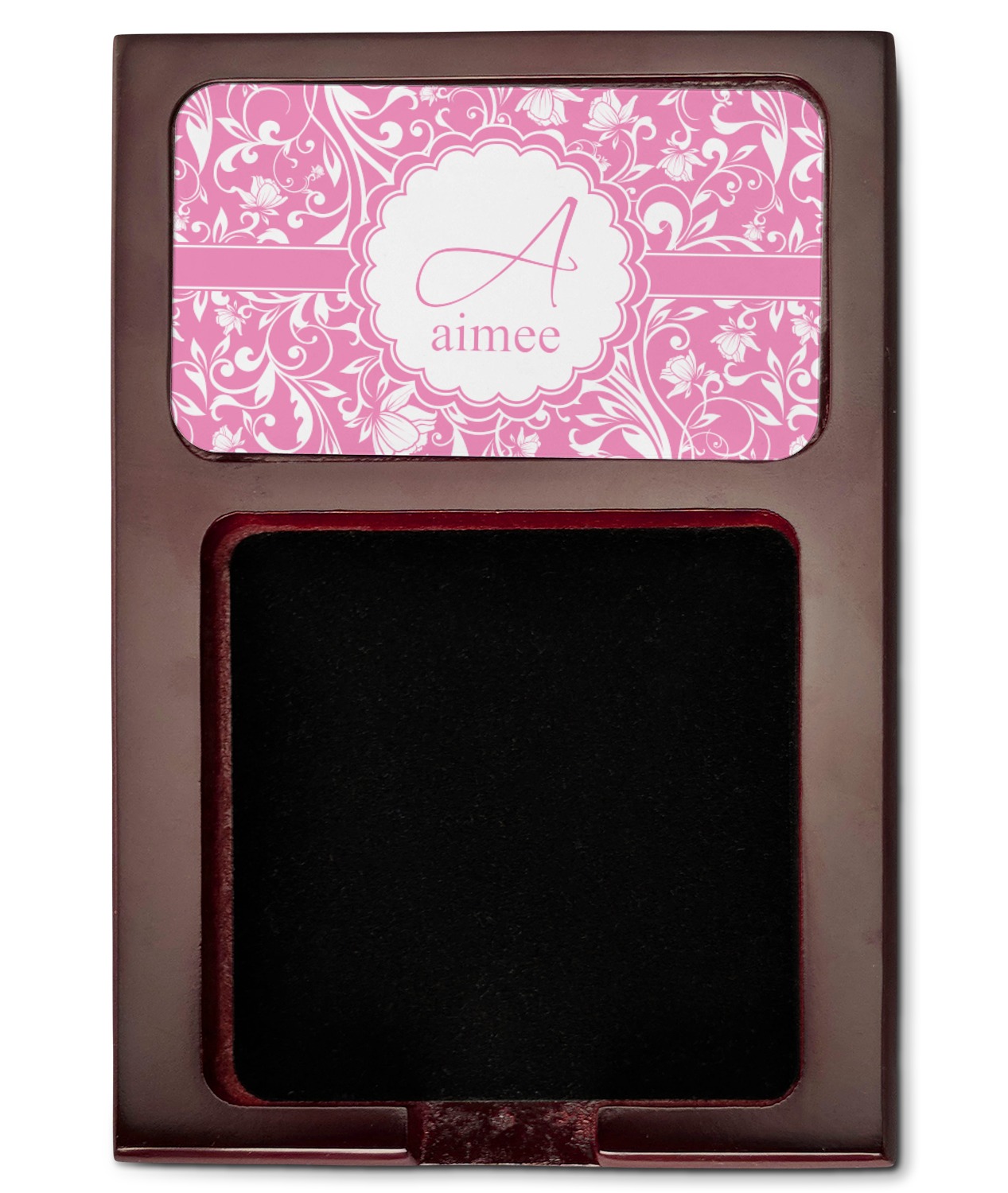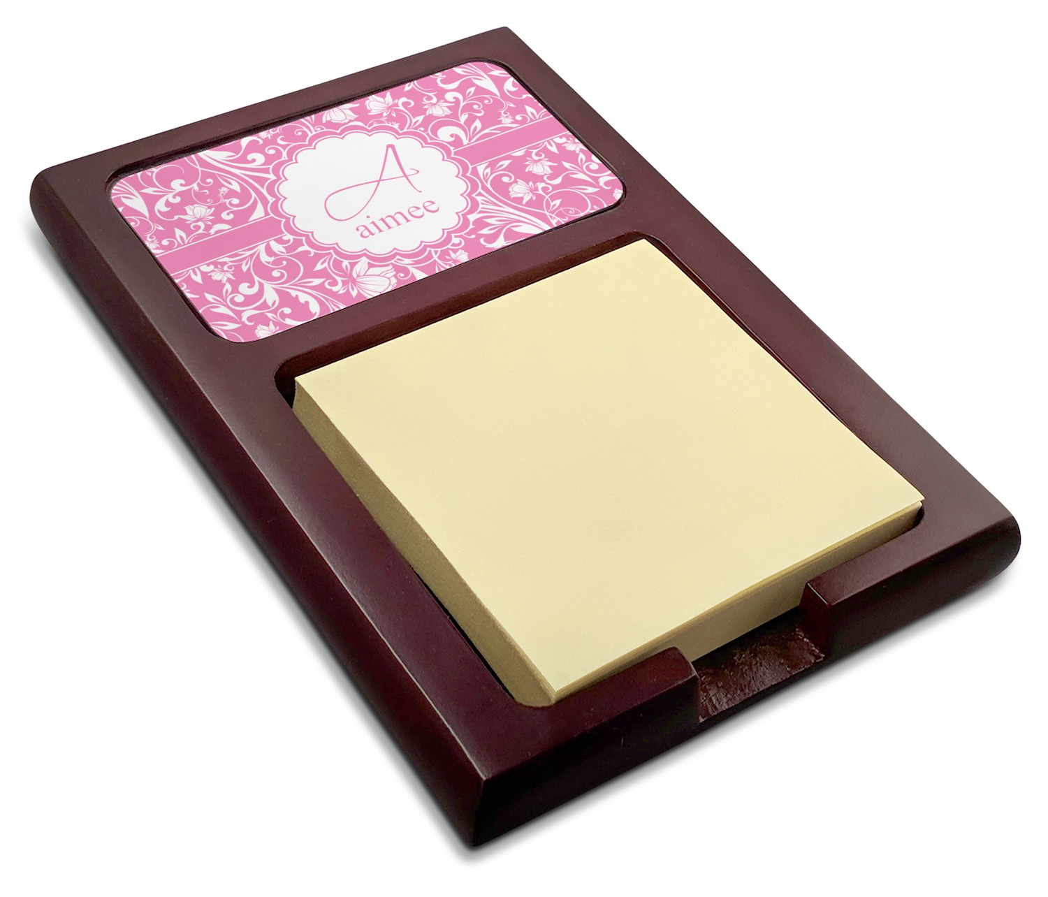 Crafted from a fine mahogany, this post it note holder is in the shade of a dark, cherry color. The dispenser itself is about 4.25 by 6.25 by 0.75 inches. You can place your 3 by 3 inch sticky notes in the indentation below the nameplate. We print your customization onto the nameplate that rests above the velvety indentation.