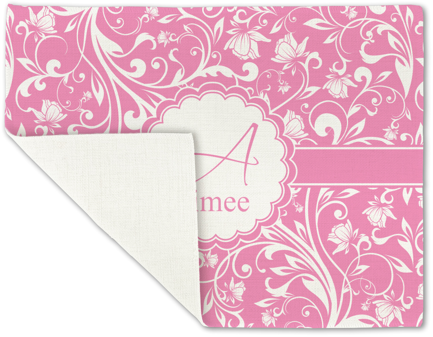 This gorgeous floral pattern combines the classic soft baby pink and white. The design has a classic ribbon in the baby pink trimmed in white. The decorative scalloped label is also in the soft baby pink and white. Add an initial and a name for that personal touch to pull the entire design together.