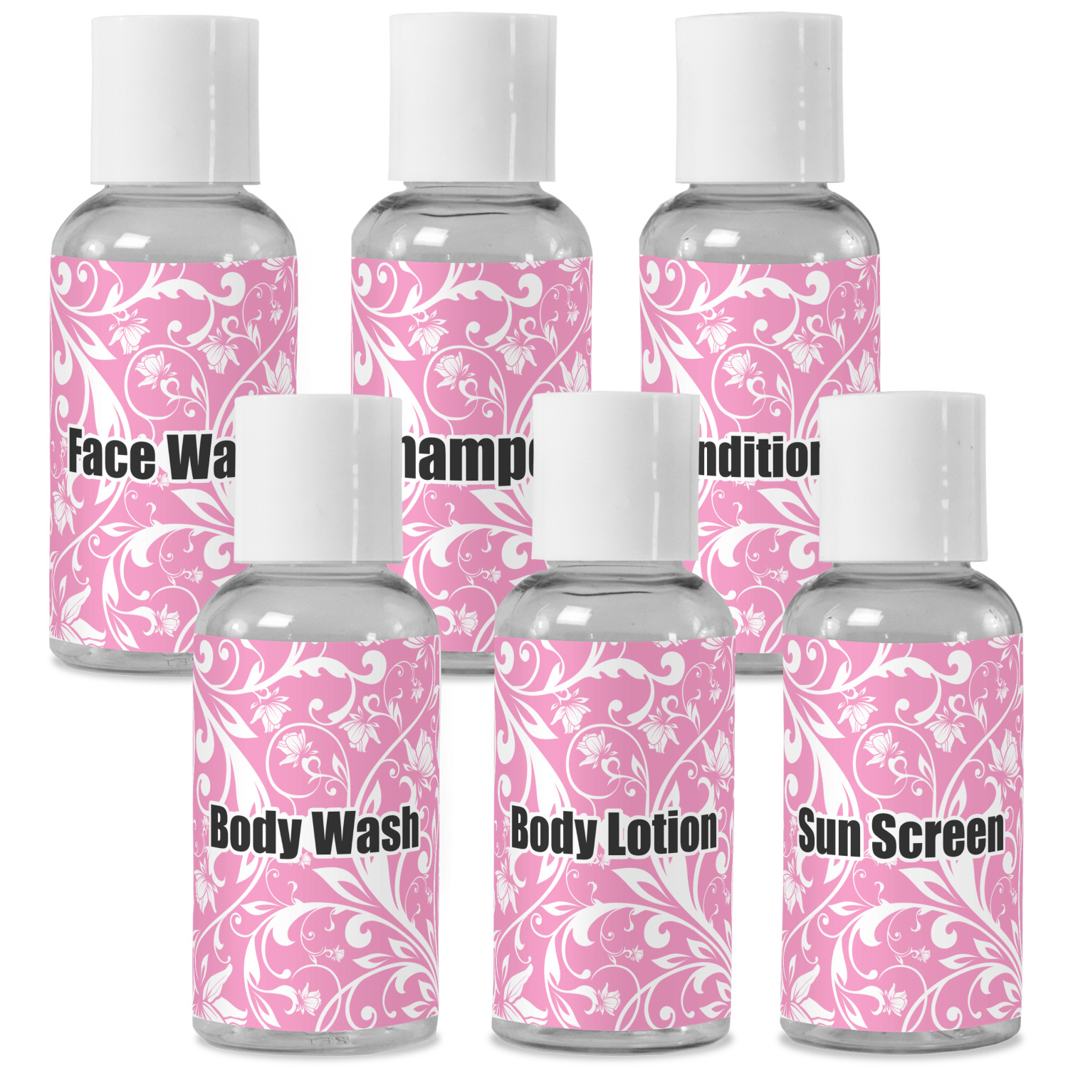 These soap and lotion travel bottles are the perfect place to start. Each set comes with 6 clear plastic bottles with white pop top lids. The bottles are cylindrical and can hold approximately 2.7oz. Perfect for plane travel!