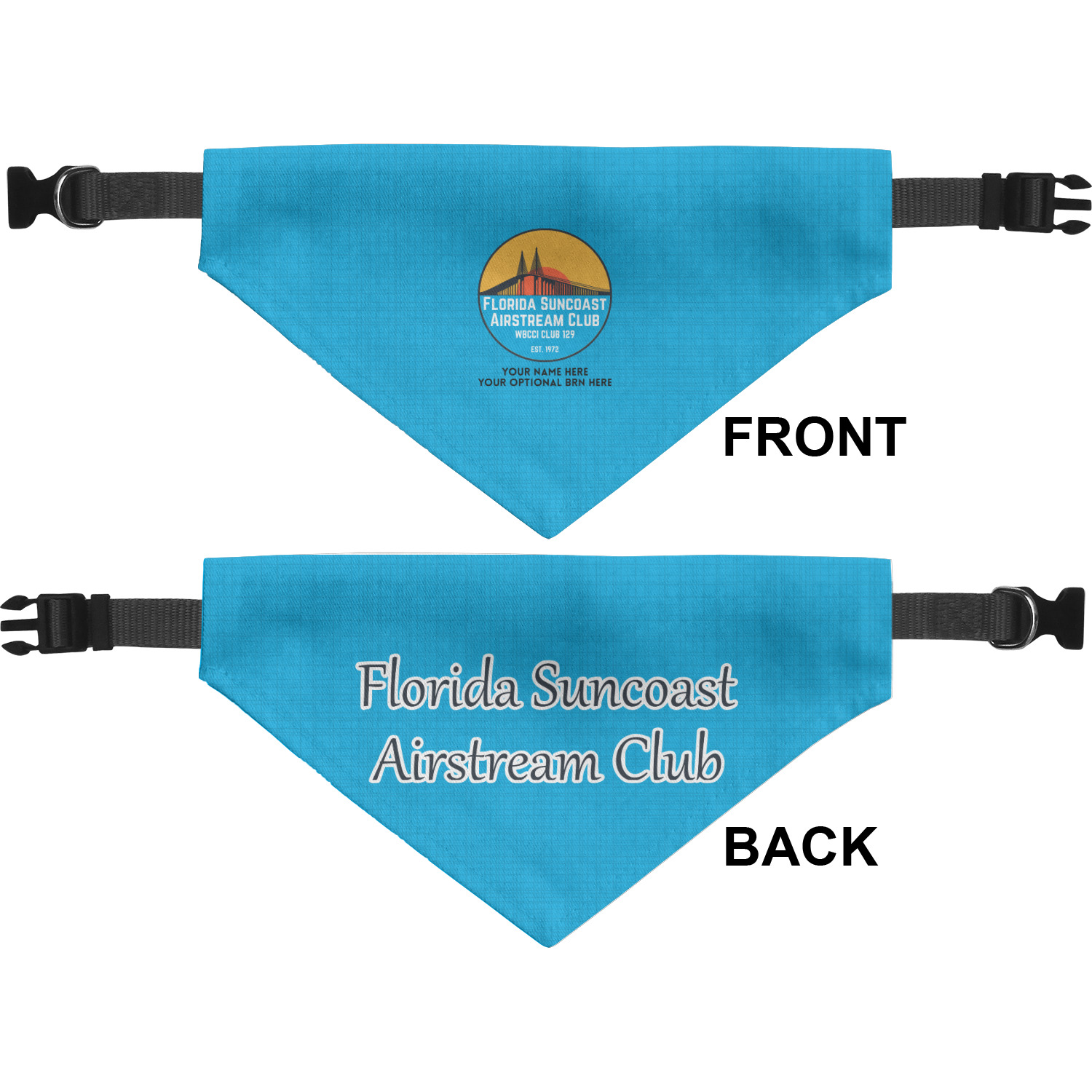 We print the front and back of these dog bandanas with your customized design. The bandana itself is made from a durable polyester, sewn together with a gap large enough to accommodate any collar. Regardless, the bandana includes a plain black, canvas collar with plastic snaps, that can easily be removed if desired. These dog bandana collars are available in four sizes: small, medium, large, and extra large. Please see our sizing chart for more information regarding the dimensions of each size.