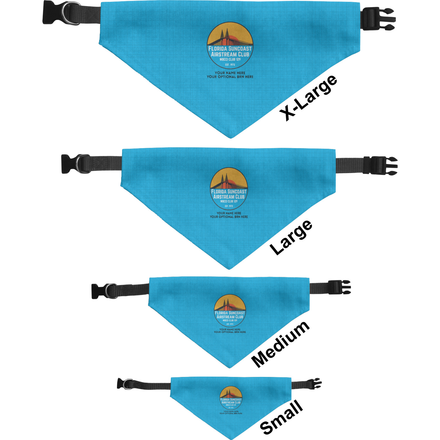 We print the front and back of these dog bandanas with your customized design. The bandana itself is made from a durable polyester, sewn together with a gap large enough to accommodate any collar. Regardless, the bandana includes a plain black, canvas collar with plastic snaps, that can easily be removed if desired. These dog bandana collars are available in four sizes: small, medium, large, and extra large. Please see our sizing chart for more information regarding the dimensions of each size.