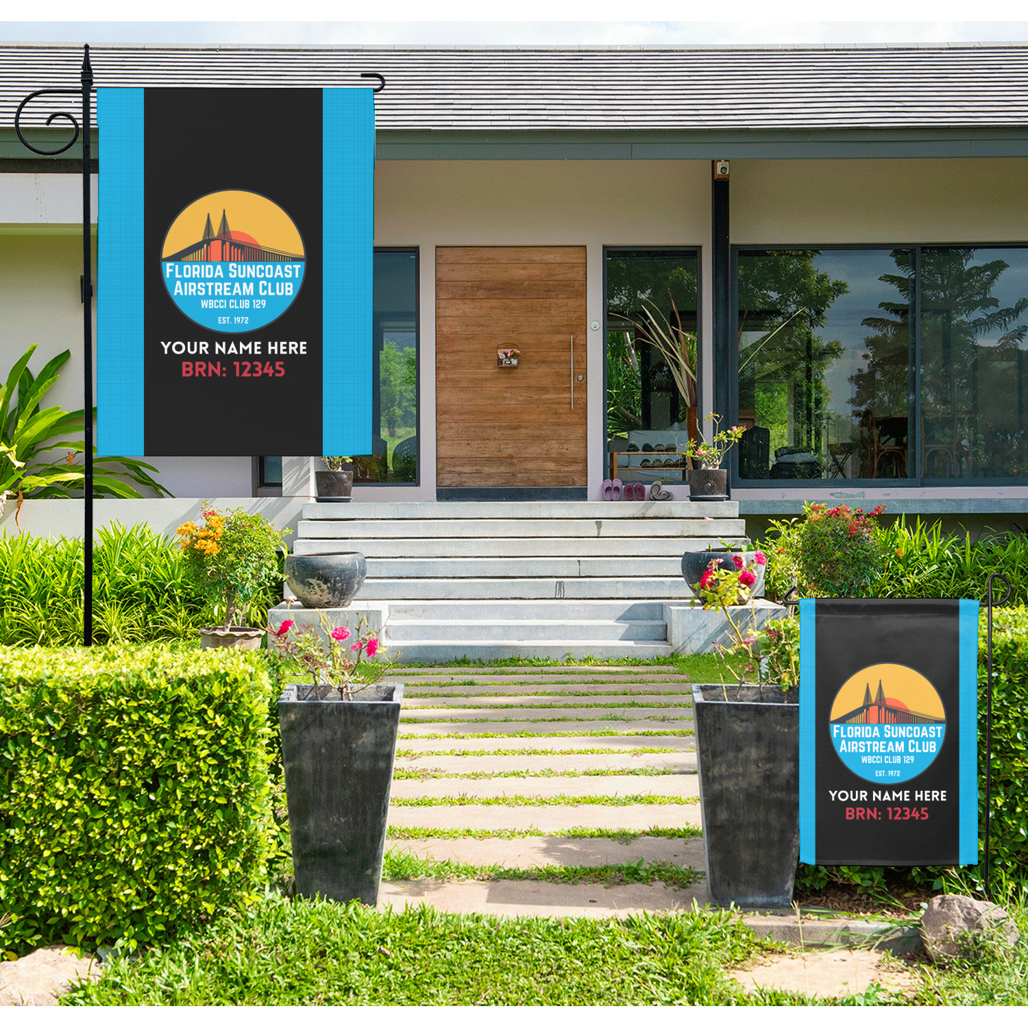 These custom garden flags are made of a durable, double-ply, polyester weave, allowing them to withstand the elements year round. The small flags measure at approximately 12 by 18 inches. The large flags measure out to 28 by 37 inches. You can order these decorative flags with your customization printed on the front only, or the front and back.
