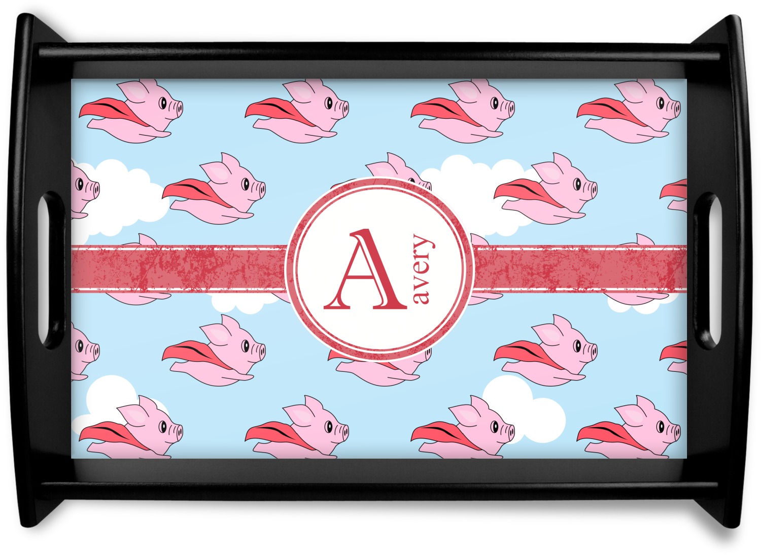 This serving tray with handles features square edges and two rounded sides, creating a very modern look. Each side is fabricated from a beautifully cut, natural wood. The bottom of the interior of the tray displays your customized design in bright, vibrant color. The tray is sold in both a black color and a natural wood look. Each variation of the wood serving tray has two sizes: Small, which is 14" x 10" x 2.25", and Large, which is 19.5" x 13.5" x 2.75".