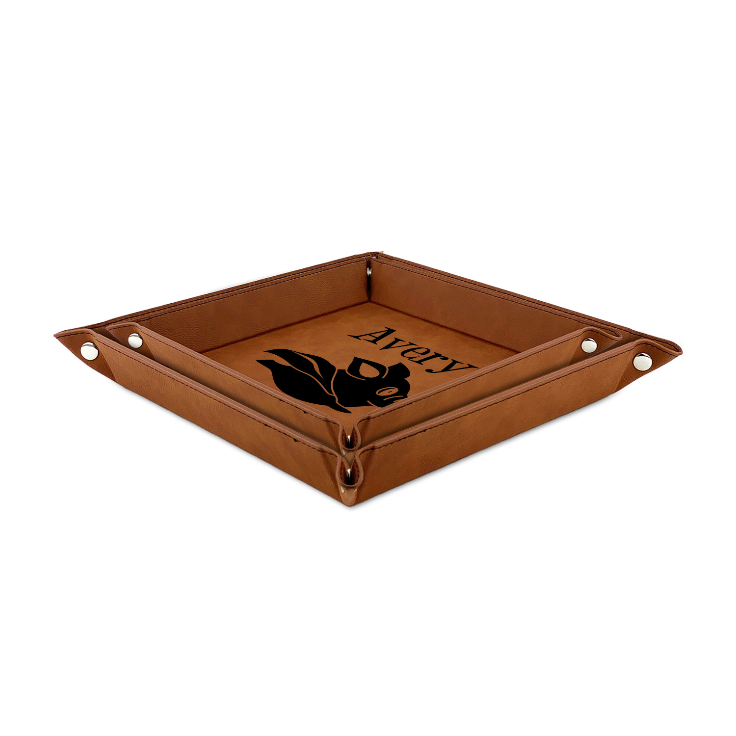The leatherette wraps the hard board base and sides with flexible hinges to fold the sides up. The corners are secured using silver snaps. The 6in x 6 in tray measures approximately 9.5in x 9.5in when laid flat. The 9in x 9in tray measures approximately 13in x 13in when laid flat.