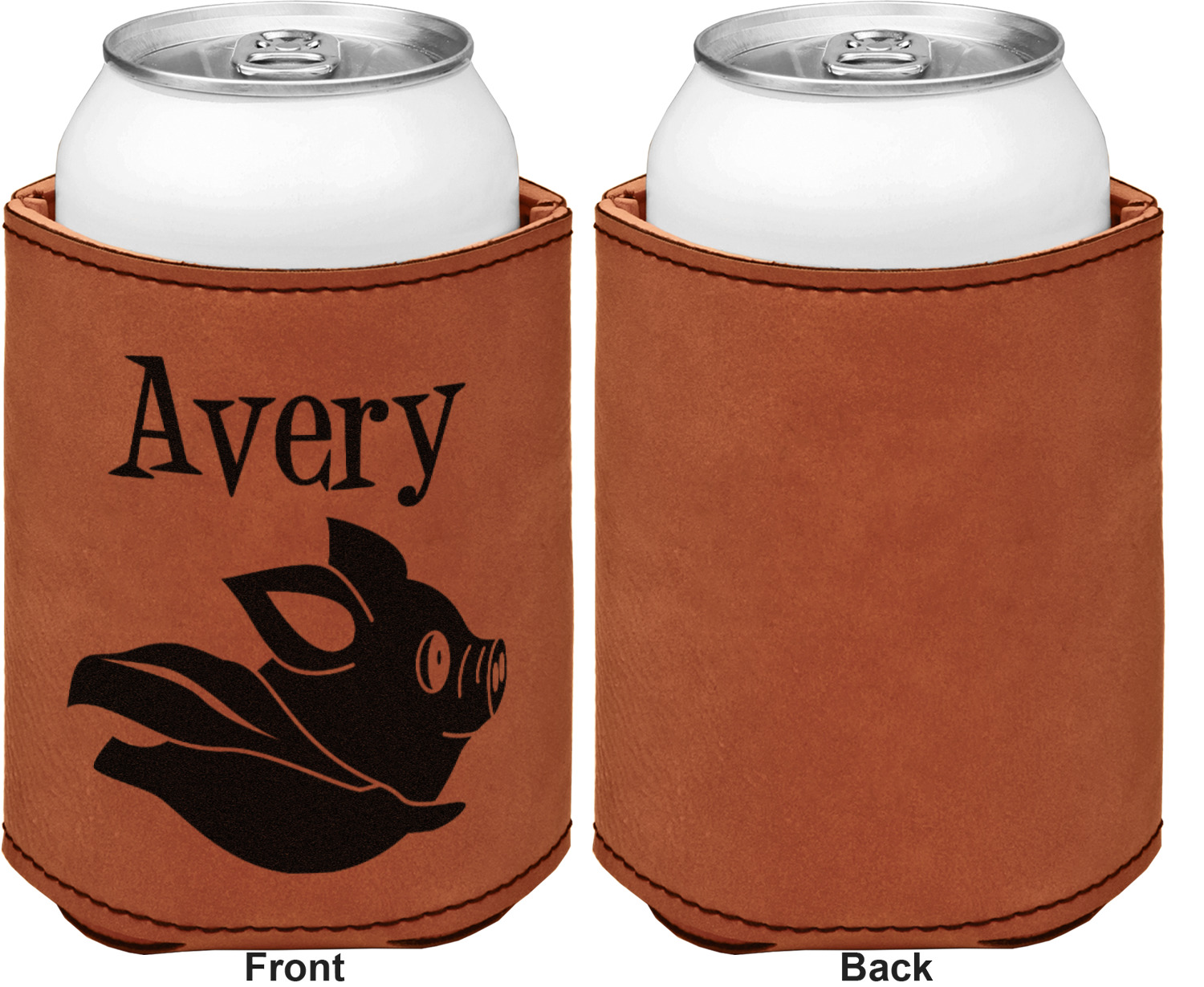 This can sleeve is made from a cognac-brown leatherette and stitched with a sturdy, black thread. A slim padding lines the inside of your can sleeve to allow for a better fit once your drink is inserted. The sleeve itself measures at 4 by 4.5 inches, allowing this custom can sleeve to accommodate most canned drinks. Your personalized design can be engraved on the front and back, or solely the front. When laser-engraved, your design appears as a black coloration which contrasts the leatherette nicely.