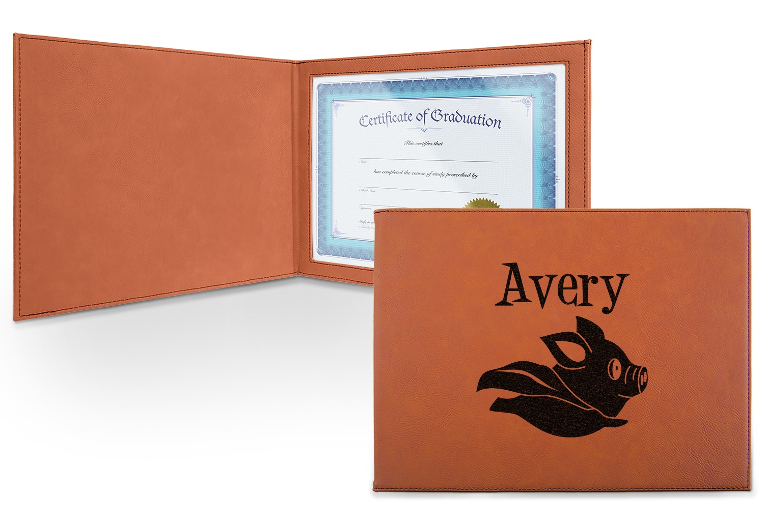 This cognac-colored, leatherette certificate jacket is the ideal way to display or store your hard-earned certificate. When closed, the custom certificate holder measures at 12 by 9 inches. The interior of the certificate cover includes a clear, vinyl window to encase your diploma. The window measures at around 10.5 by 7.5 inches and can accommodate a diploma that measures at up to 8.5 by 11 inches. You can either choose to have your customization laser engraved on the front and interior, or solely the front.
