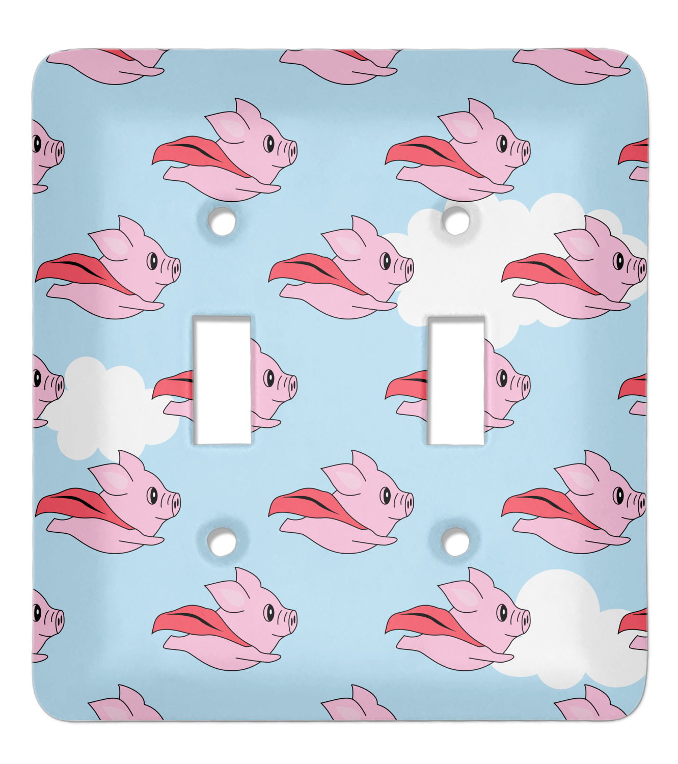 This design with pigs flying is simply fun and playful. The background is of course the sky. We then have a pink pig wearing a red hood flying like a super hero!