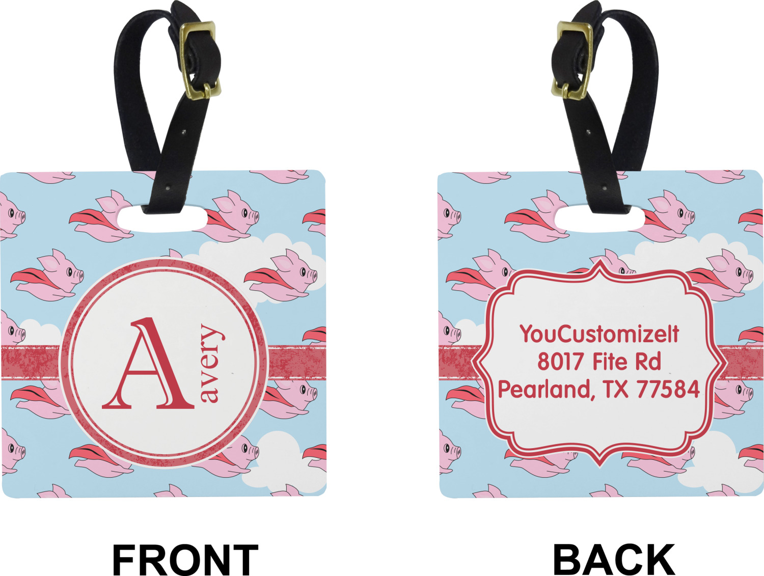 These cute luggage tags are made of a fiber-reinforced, UV-resistant plastic, making them waterproof and durable enough for both everyday use and the rugged adventures of any traveler! A leather strap with holes and a buckle is included with your purchase and can be used to attach your custom luggage tag to any suitcase, backpack, or duffel bag. You can design these travel tags as you wish; your customization will be displayed across the front, while the back will show as little or as much personal information as you want.