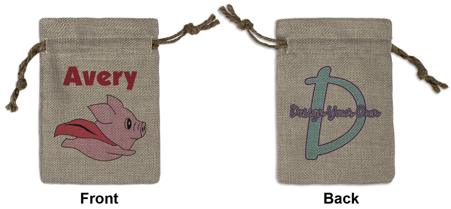 We sell our Burlap Gift Bags in 3 variant sized bags. Made with burlap polyester, each personalized bag can be secured with a twine drawstring pull. Your custom design is available to print on one side or both sides - completely up to you! The sizes of the bags measure approximately 4.5" x 6.5" for the smallest size, 6.5" x 8.0" for the medium size, and 6.5" x 13.5" for the large-sized bag.