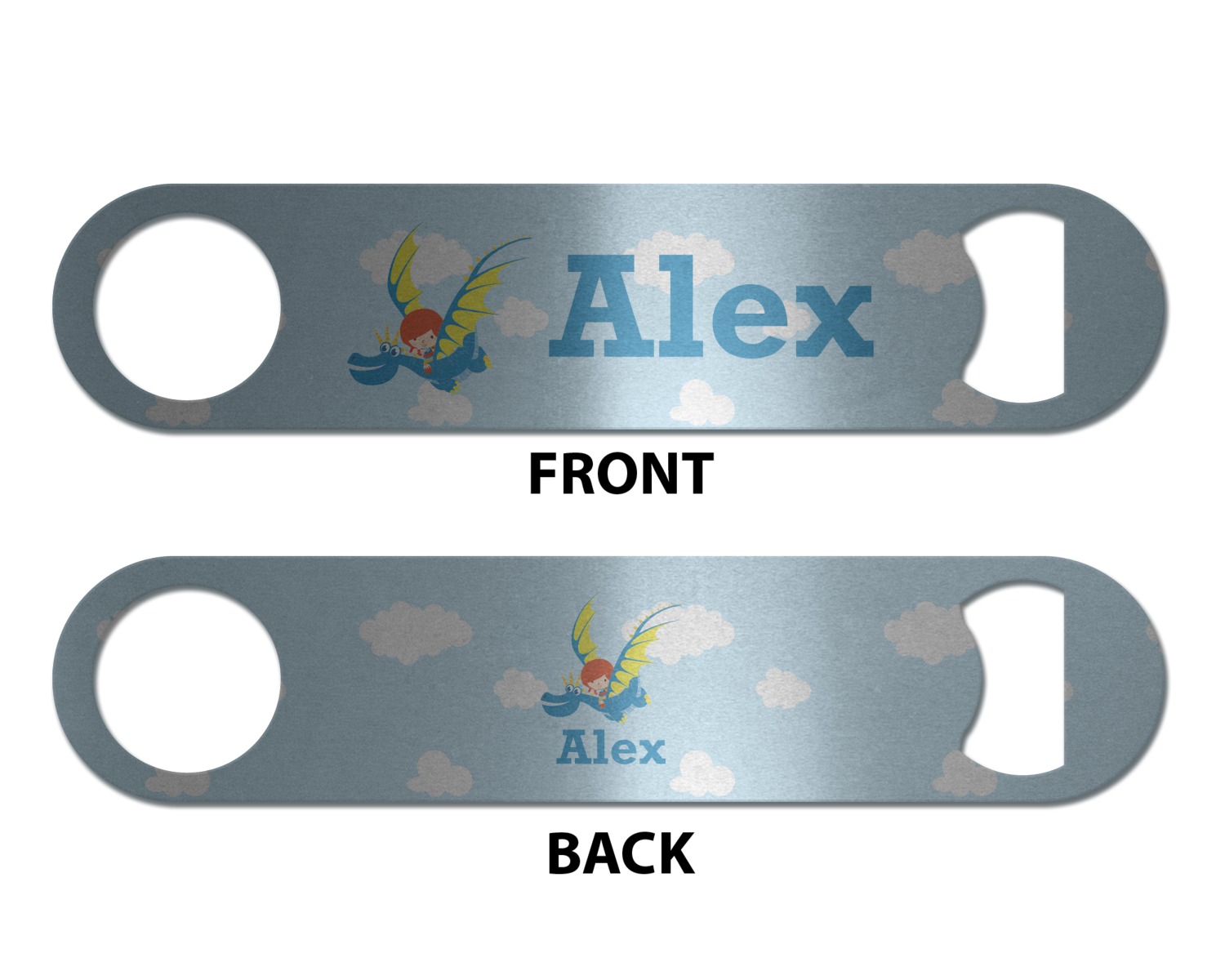 Made from stainless steel, these beer bottle openers are 7 by 1.625 inches, giving you plenty of leverage when trying to open a stubborn bottle. On one end of this personalized bottle opener, you'll find a circular hole for you to hang and display your opener. On the opposite end, you'll find the tool used for opening bottles. This opener in particular has the same structure and style as professional bartender bottle openers. Your customization is sublimated onto both the back and front, and both sides can be customized individually. Choose from one of our two base colors - white or silver.