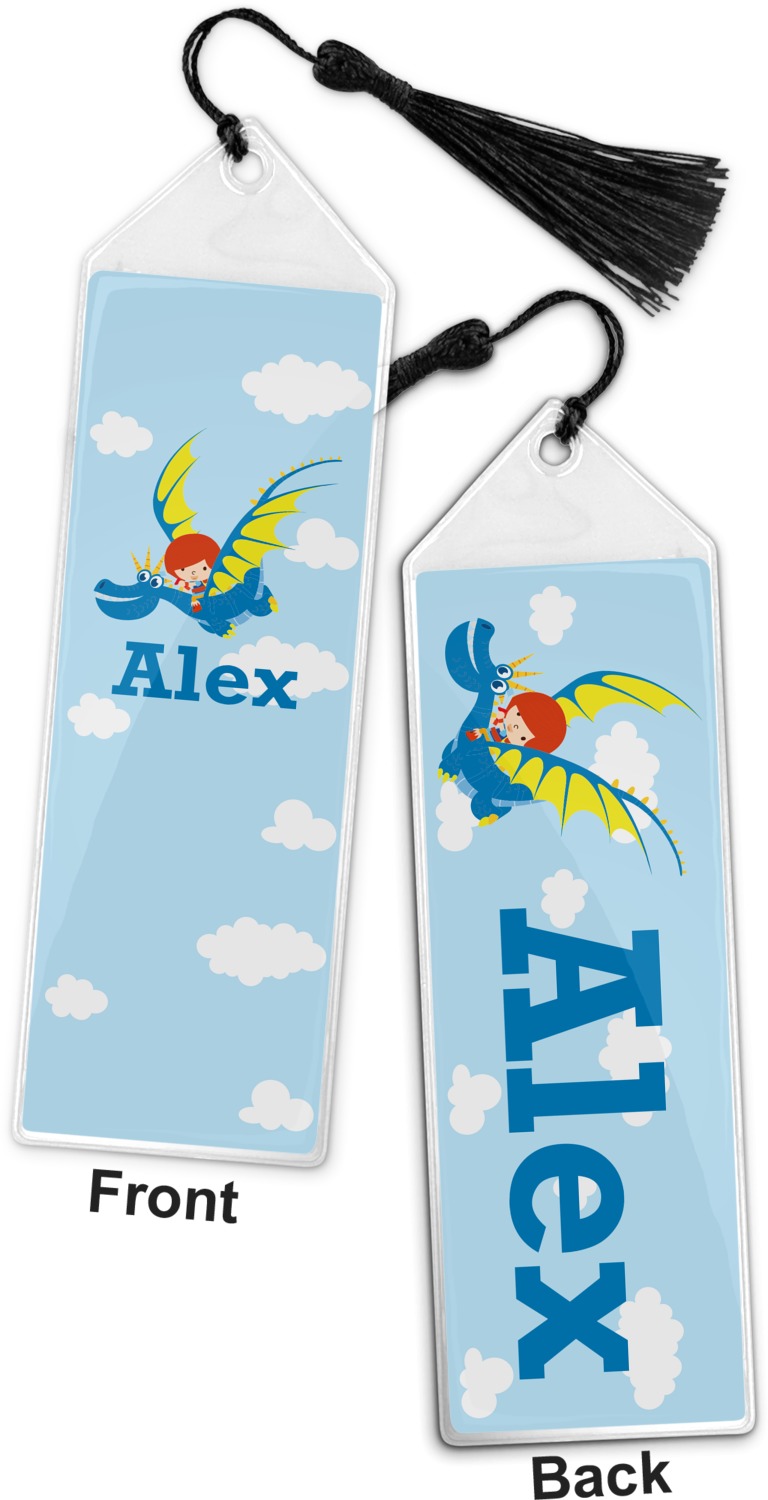 Your personalized bookmark is made of a sturdy, clear vinyl, and is approximately 7.5" x 2.25". We display your personalization on vinyl inserts that are placed on both sides. Accompanying each book marker is a black, fringe tassel that attaches to the reinforced, triangular header.