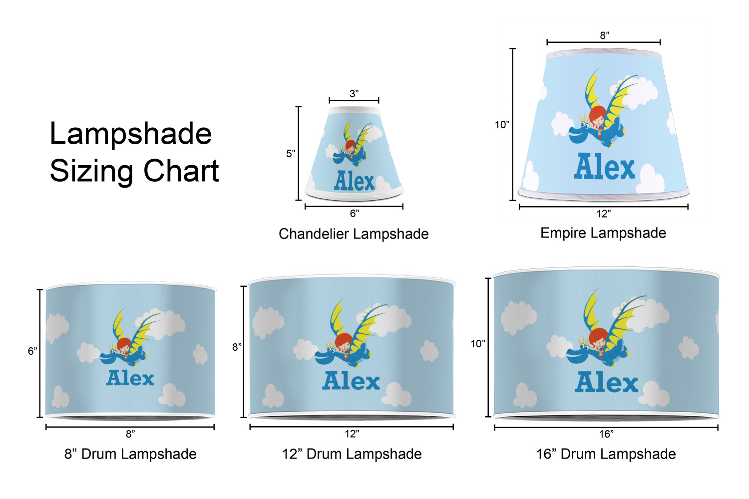 Our customized lamp shades also come in 3 different sizes: 8", 12" and 16", measuring at 8" in diameter by 6" tall, 12" in diameter by 8" tall, and 16" in diameter by 10" tall, respectively.