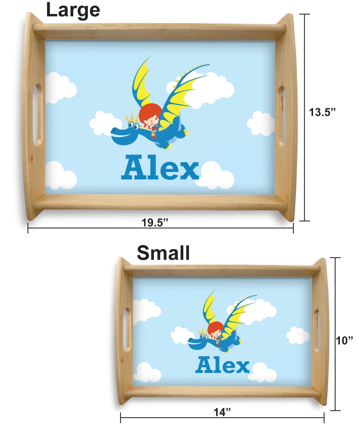 This serving tray with handles features square edges and two rounded sides, creating a very modern look. Each side is fabricated from a beautifully cut, natural wood. The bottom of the interior of the tray displays your customized design in bright, vibrant color. The tray is sold in both a black color and a natural wood look. Each variation of the wood serving tray has two sizes: Small, which is 14" x 10" x 2.25", and Large, which is 19.5" x 13.5" x 2.75".