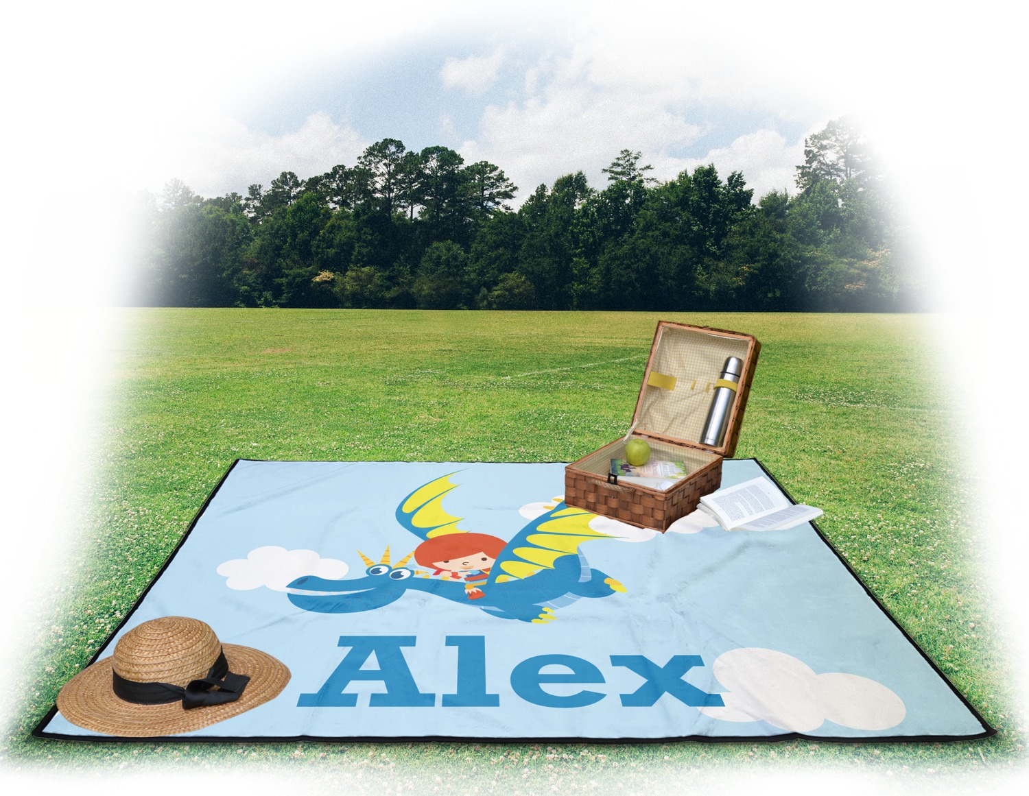 This picnic blanket is perfect for hanging out with your friends at the park or anywhere outside. The top of the blanket is made of a super soft microfiber fleece. The bottom of the blanket is made of a black material similar to a rain jacket and is water repellent as well. This will keep any wet spots on the ground from soaking through your picnic blanket. No one likes a wet blanket. The blanket measures at approximately 50" x 59" and has a nicely finished ribbon edge.