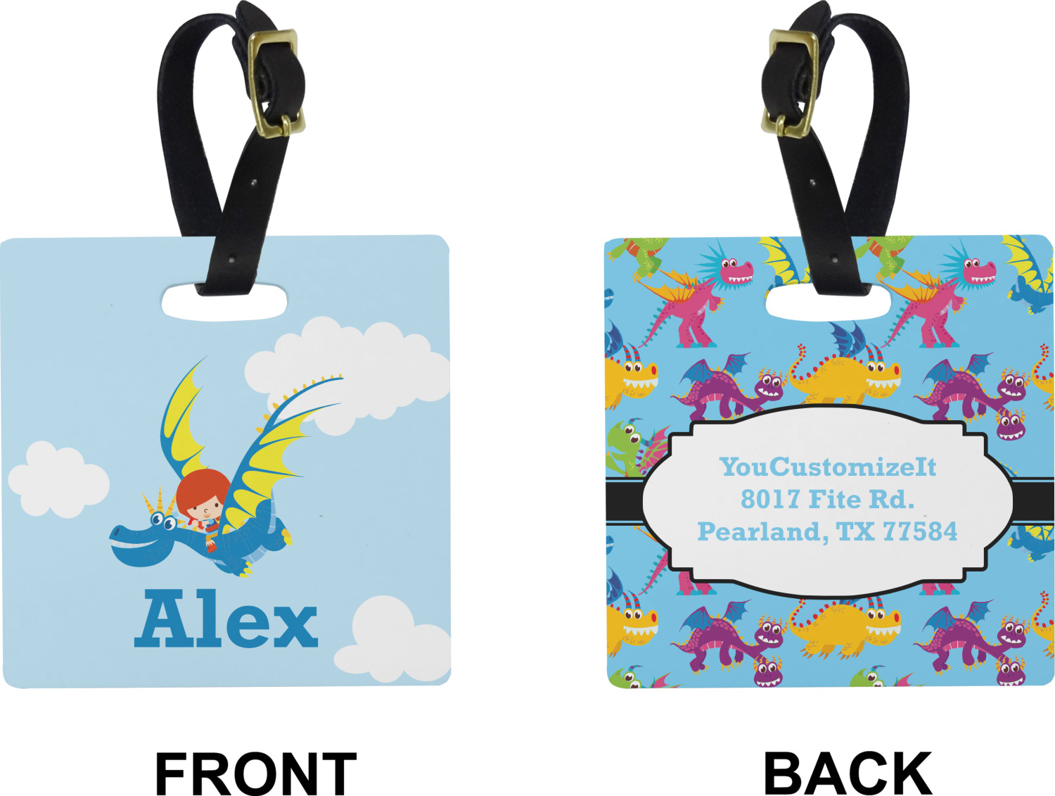 These cute luggage tags are made of a fiber-reinforced, UV-resistant plastic, making them waterproof and durable enough for both everyday use and the rugged adventures of any traveler! A leather strap with holes and a buckle is included with your purchase and can be used to attach your custom luggage tag to any suitcase, backpack, or duffel bag. You can design these travel tags as you wish; your customization will be displayed across the front, while the back will show as little or as much personal information as you want.