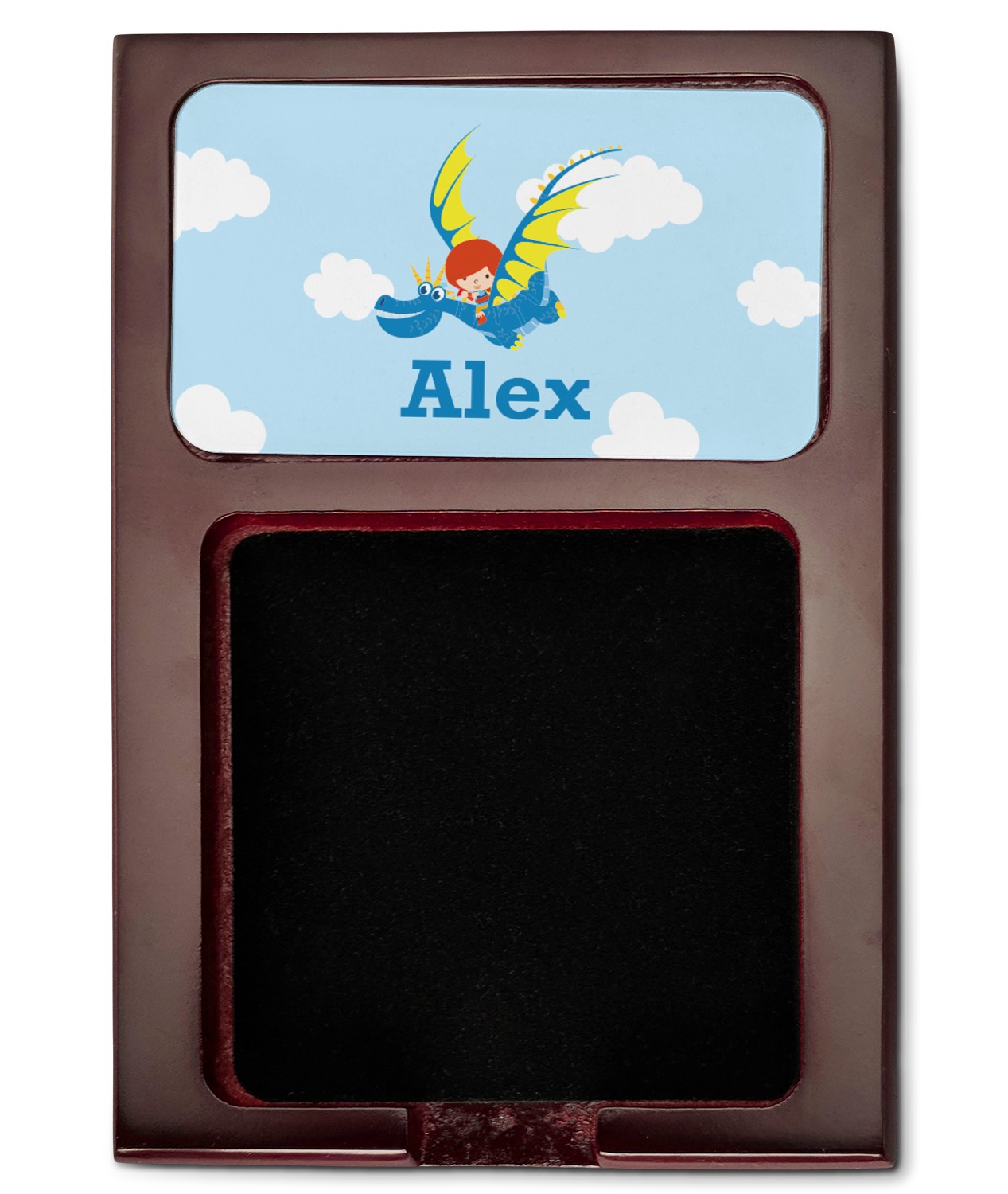 Crafted from a fine mahogany, this post it note holder is in the shade of a dark, cherry color. The dispenser itself is about 4.25 by 6.25 by 0.75 inches. You can place your 3 by 3 inch sticky notes in the indentation below the nameplate. We print your customization onto the nameplate that rests above the velvety indentation.