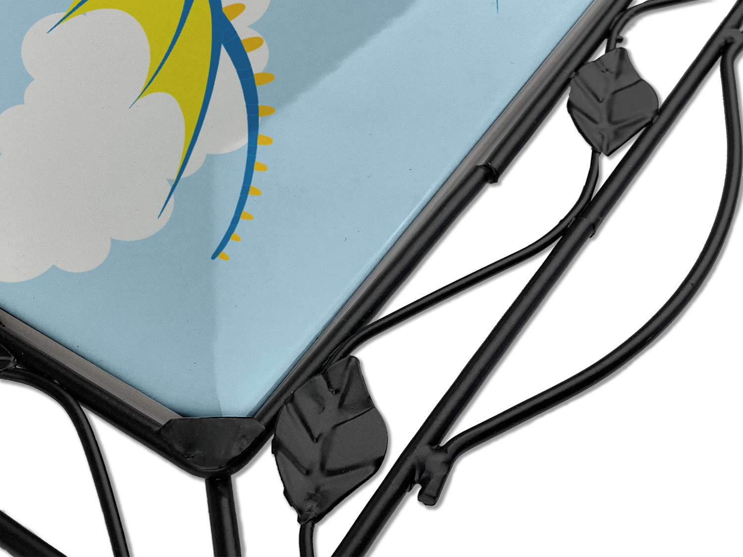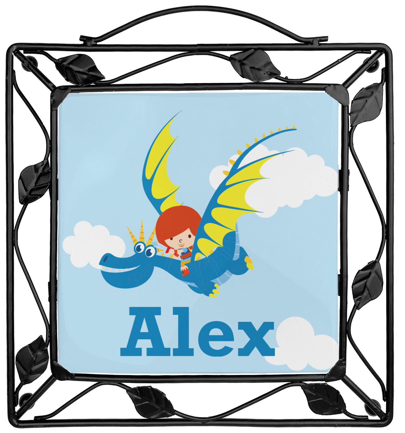 Our square trivets are made from a durable, wrought iron. This model features 4 small half circles, one on each corner, and a larger ring of iron that circles the central, customized tile. Each of the 4 corners has a round foot on its bottom for stability. This trivet is 8.75 by 8.75 inches, but the central tile measures at 6 inches on both sides.