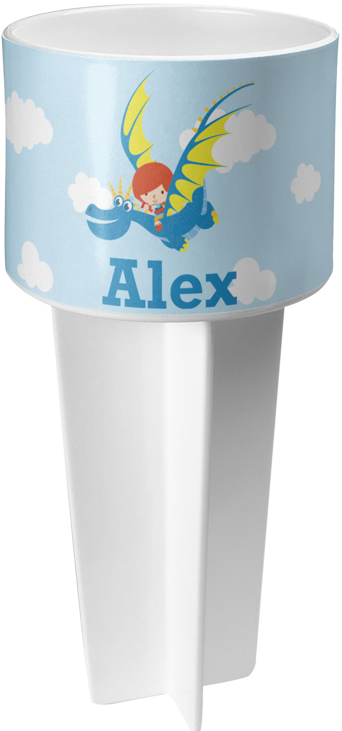 This cup holder has a large stake at its bottom that anchors it to the sand or ground below, while the cup holder rests above the stake. The entire drink holder is made of durable plastic and displays your customization around the cup holder portion. We sell these personalized beach spikers in two different colors: black and white.