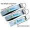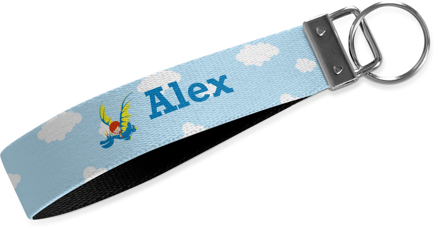 These key fob keychains are made from a polyester weave, right here in the USA. They feature a silver, metal clasp, attached to a round keyring. The piece gives the personalized wristlet a beautiful, finished look. Your customized design is printed on the outside of the keychain strap. We carry these wristlets in two sizes: small, which is 5 inches in width, and large, which is 5.5 inches in width.